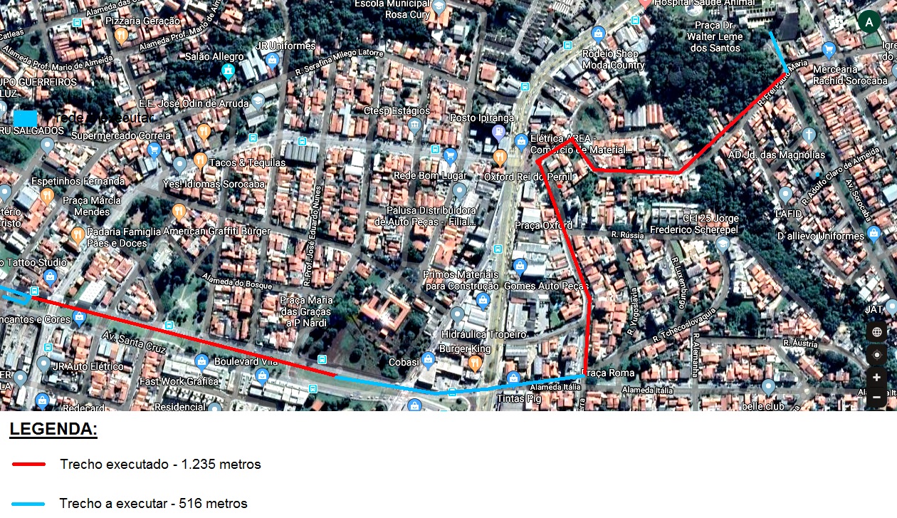 Na atual frente de trabalho, dos 500 metros projetados para a avenida Santa Cruz, 350 já estão concluídos. Os tubos da nova adutora nesta via começaram a ser assentados a partir do cruzamento com a rua Serafina Milego Latorre e estão subindo no sentido bairro-centro.
