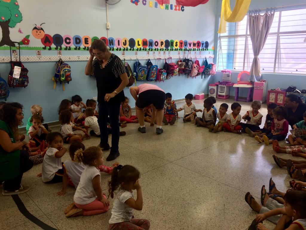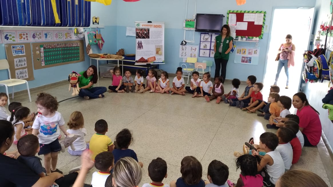 A ação contou com a participação de 4 turmas, com aproximadamente 80 estudantes, de 2 a 4 anos. Os pequenos aprendizes puderam participar de roda de conversa com o fantoche do indiozinho e pintura no rosto com as cores primárias extraídas pelos nativos brasileiros dos frutos e dos minerais presentes na natureza.