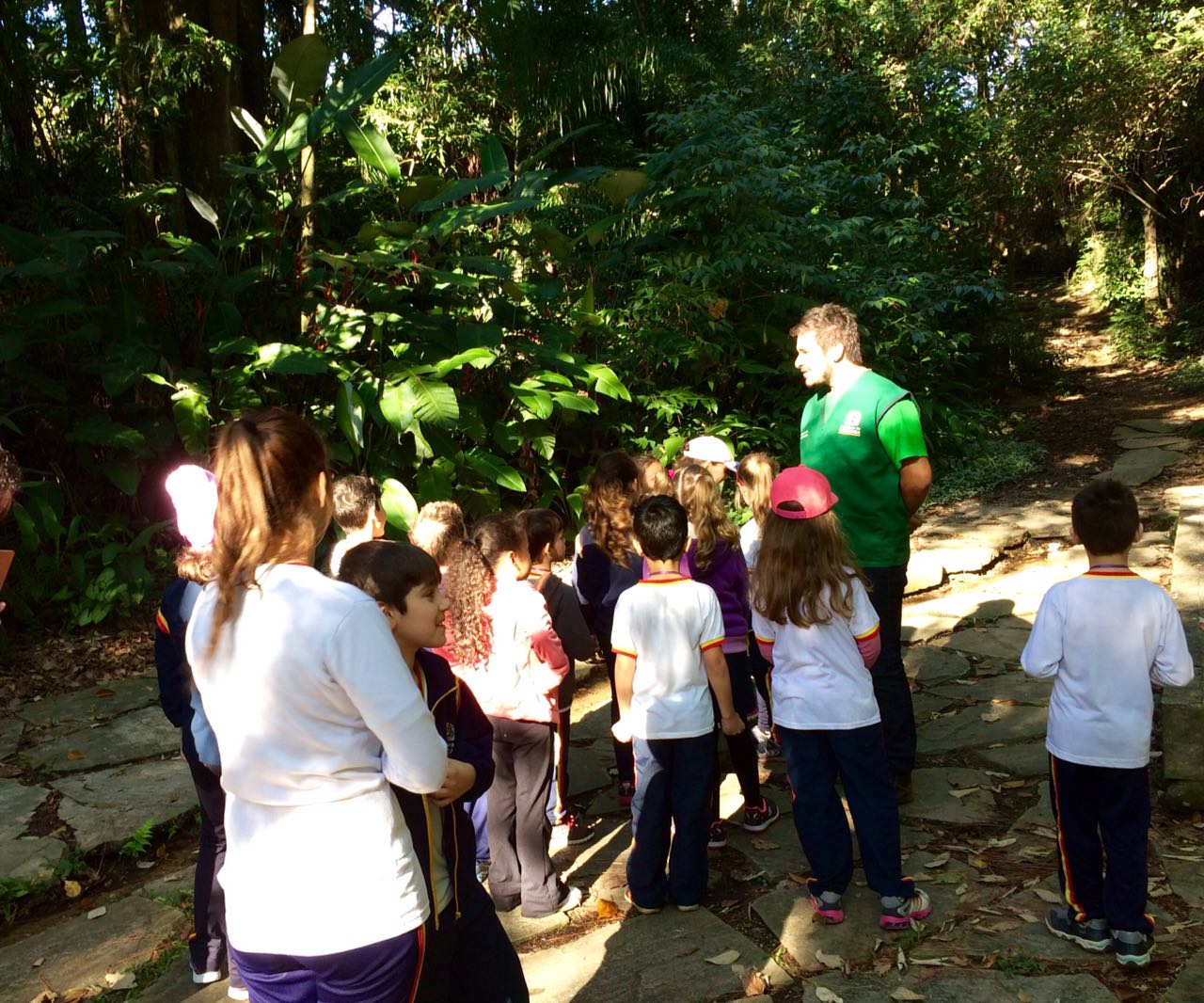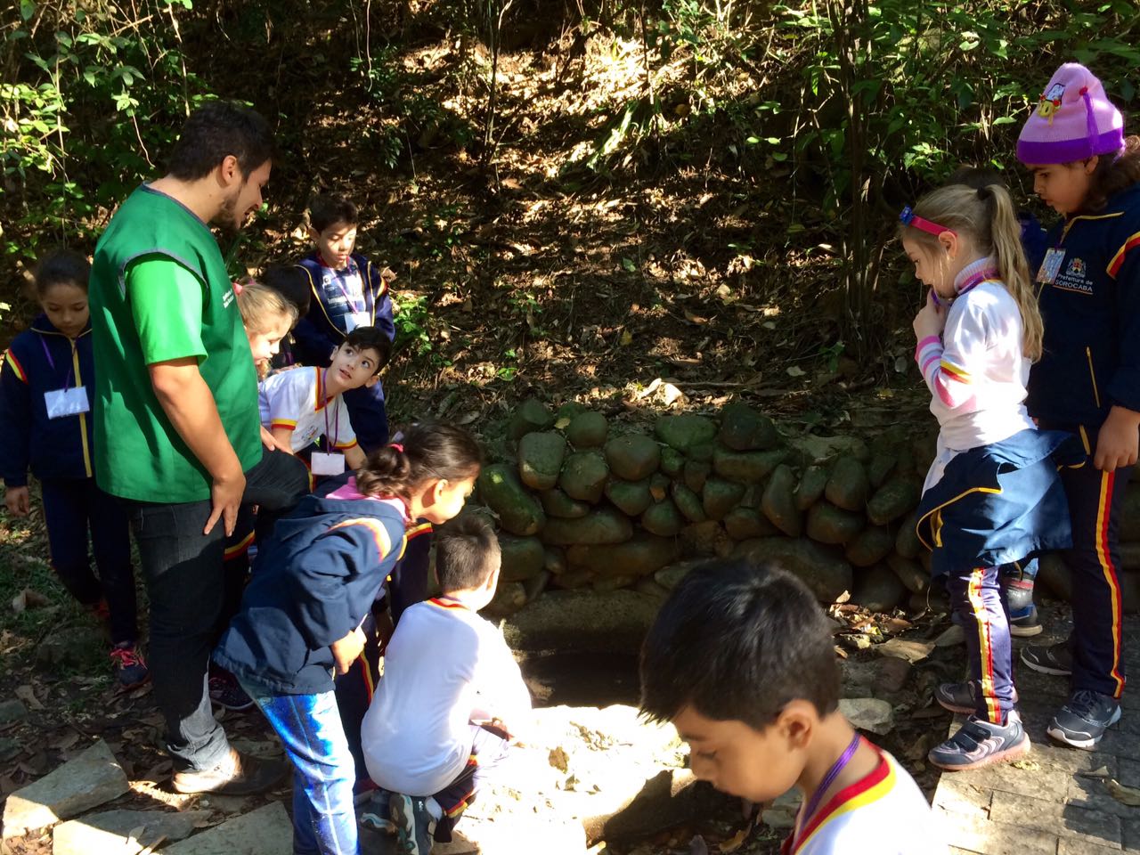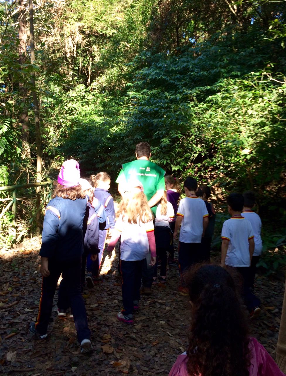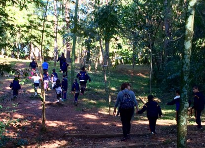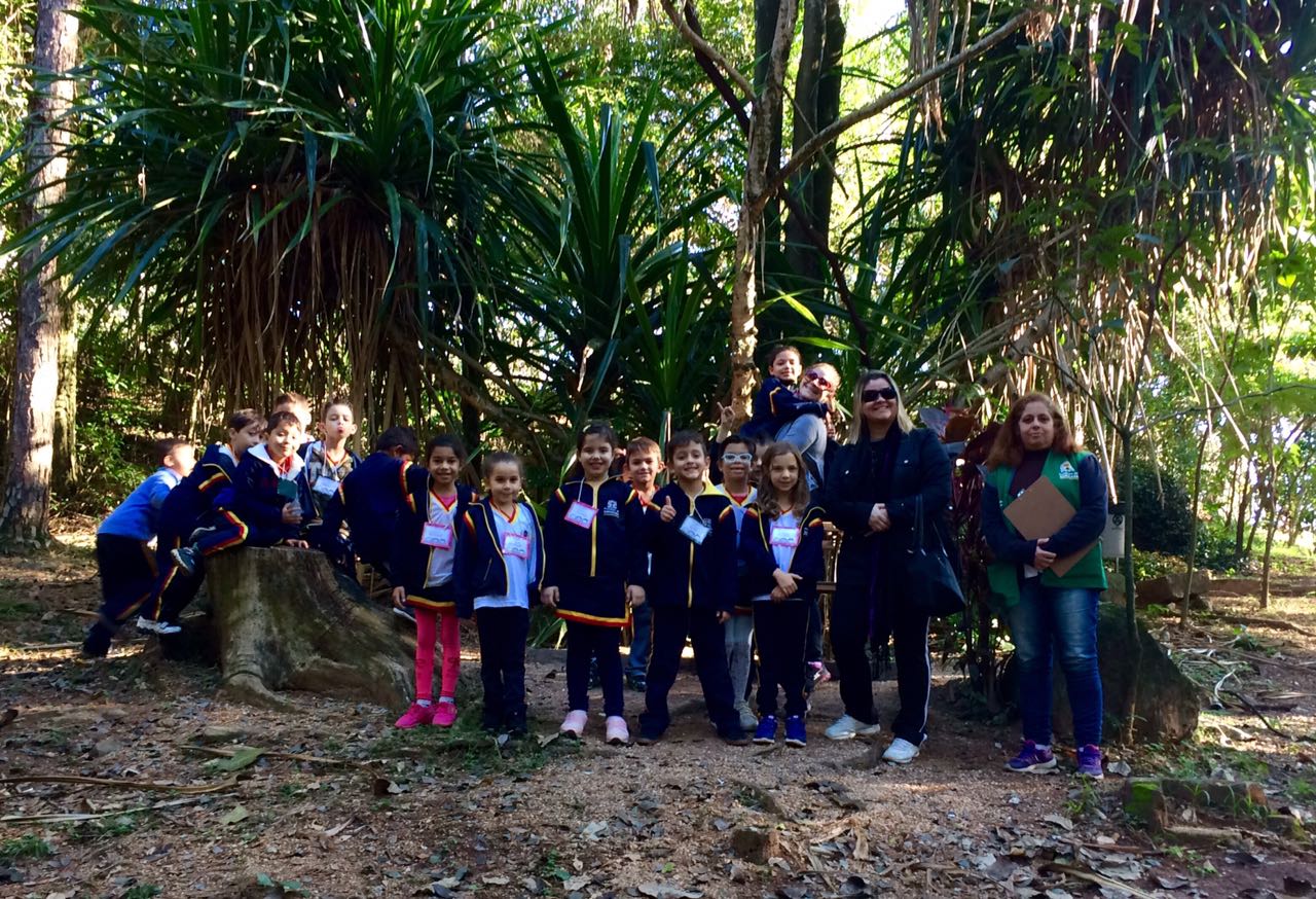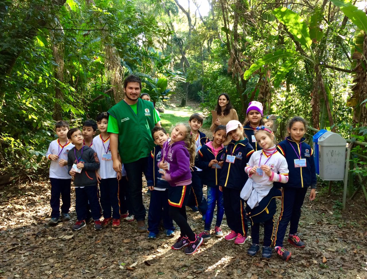 Durante a caminhada pelas trilhas os alunos tiveram a oportunidade de conhecer a história do parque, a nascente que deu o nome e algumas espécies de árvores e aves que habitam o local.