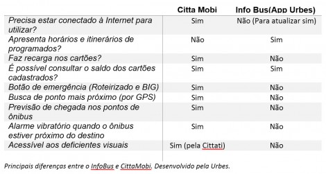 Principais diferenças entre o InfoBus e CittaMobi. Desenvolvido pela Urbes.