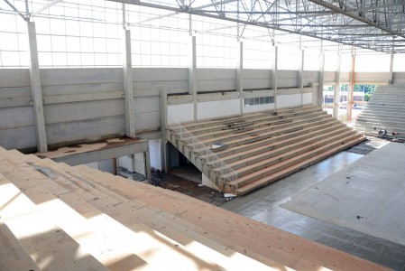 Espaço entre arquibancada e quadra recebe o material