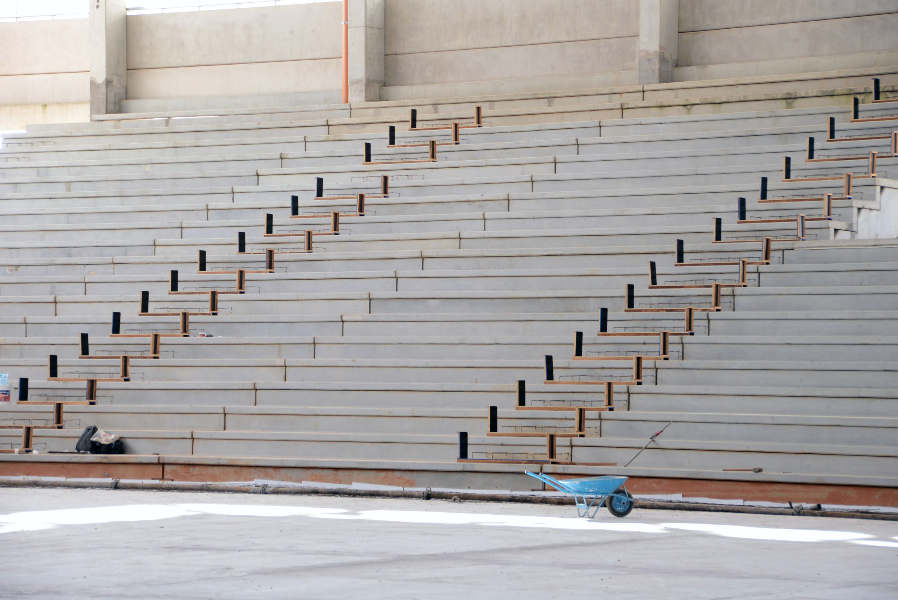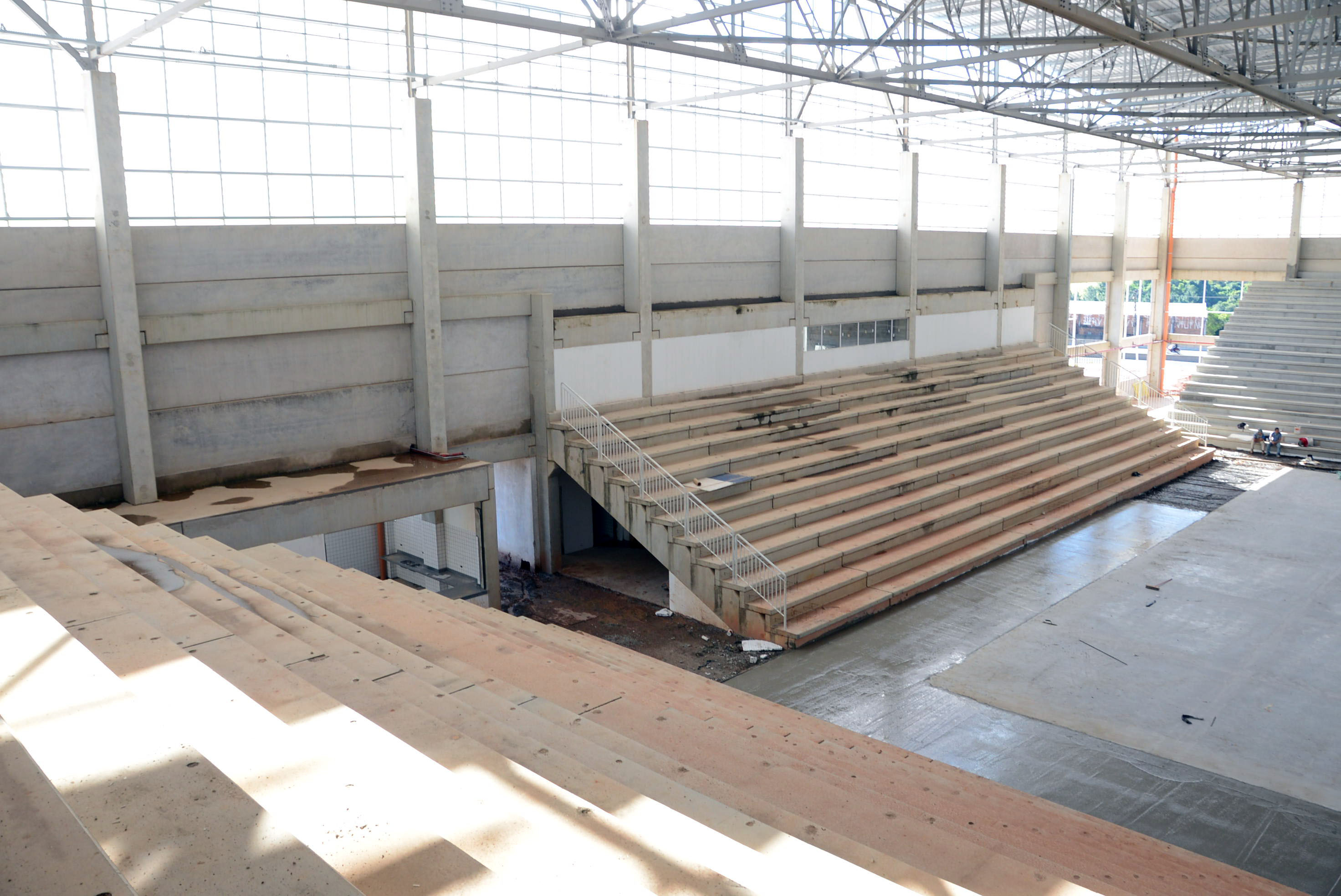 Além disso, funcionários da Progredior, empresa responsável pela obra, faziam a limpeza de uma das arquibancadas. As arquibancadas laterais terão cada uma sete escadas de acesso às cadeiras. Já as arquibancadas que ficam atrás das traves (gols) terão três escadas cada uma. A capacidade é para atender até 4 mil pessoas sentadas e as cadeiras já estão na Arena.