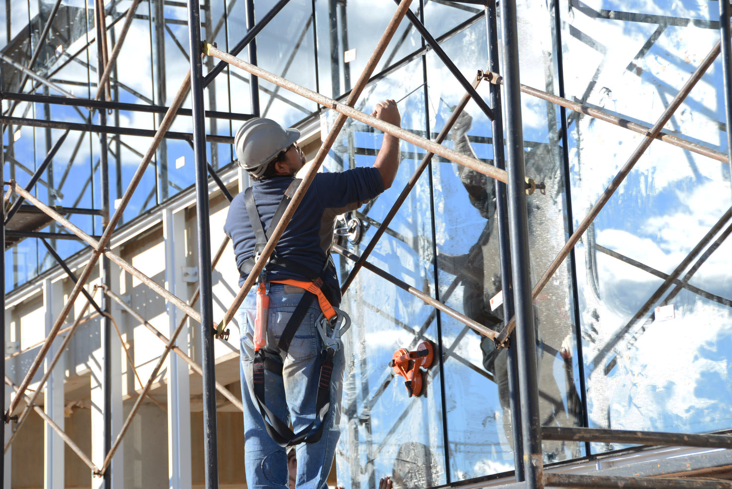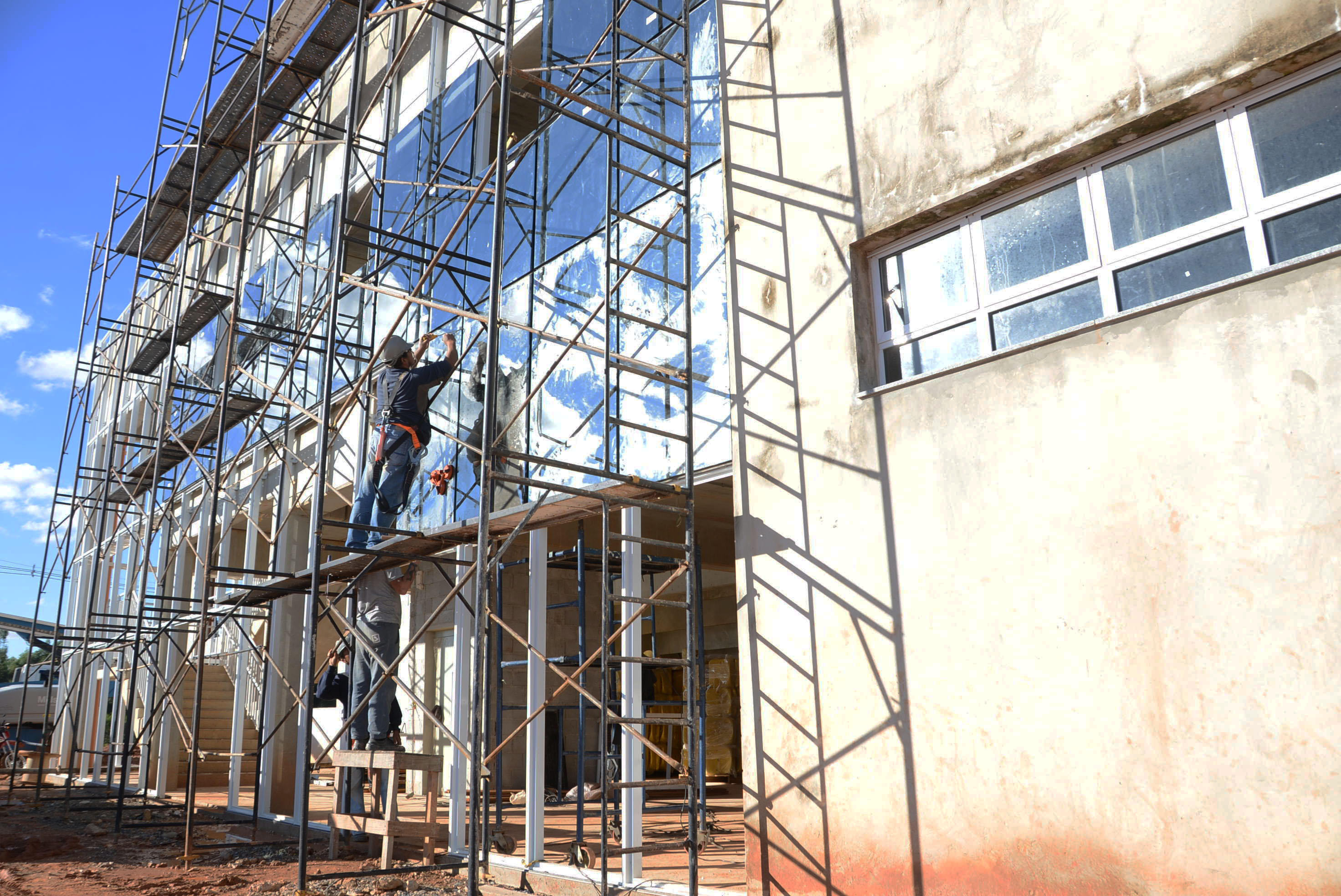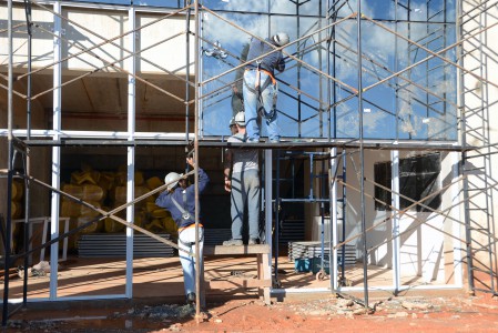 A colocação de vidros nas esquadrias de alumínio da entrada principal avança. Todas as outras esquadrias dos banheiros já receberam vidro.
