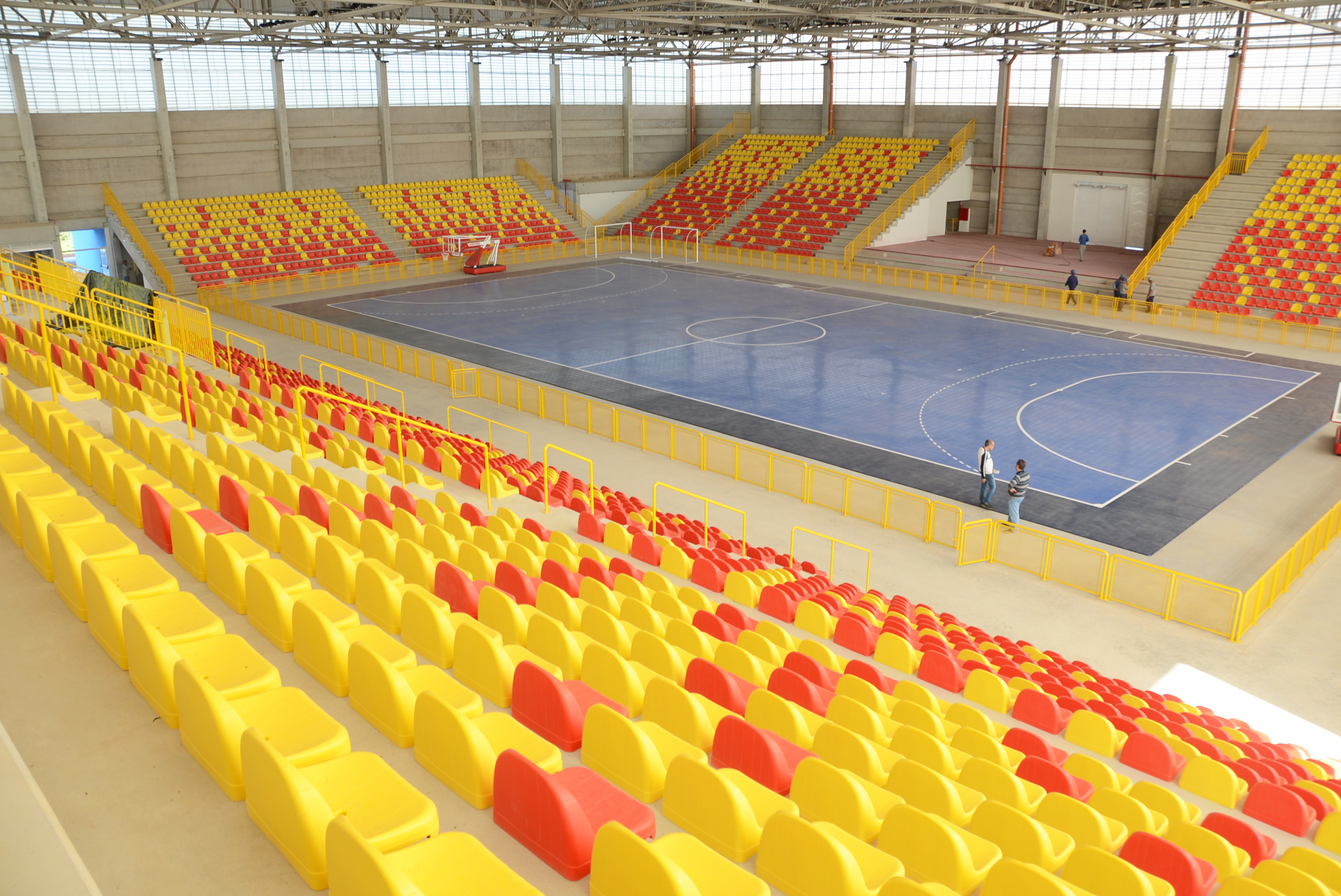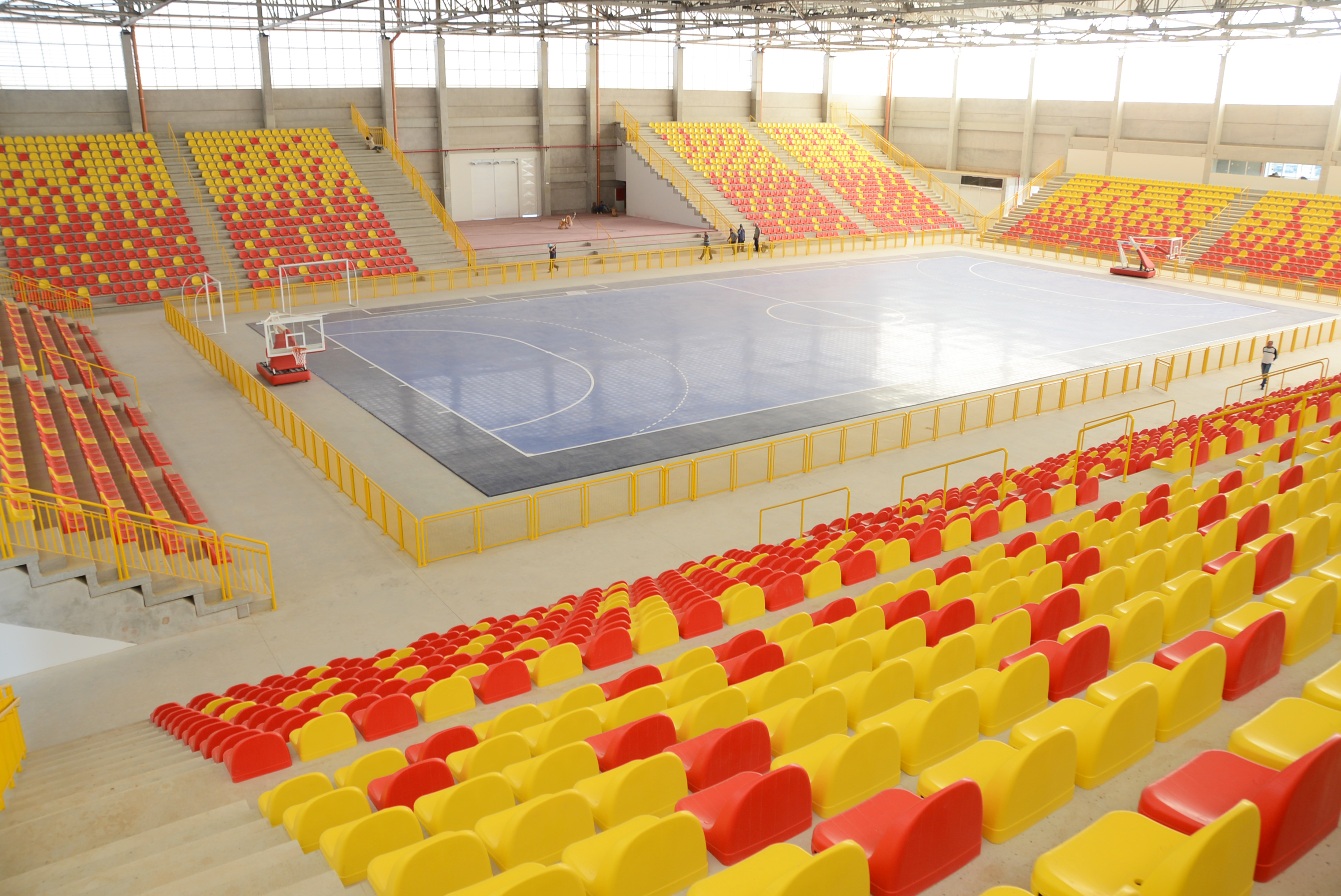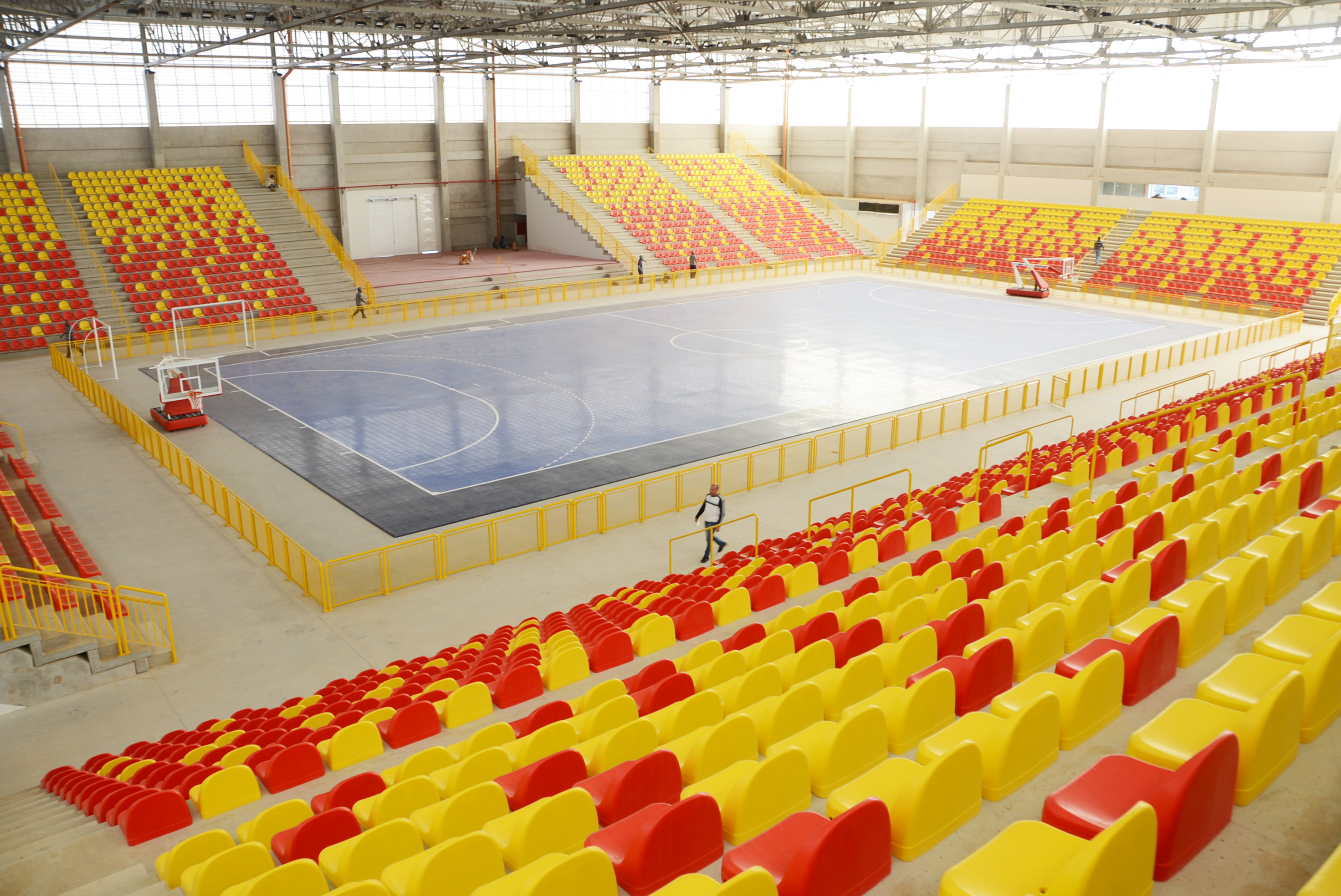 Já o revestimento colocado na quadra é o que há de mais moderno em tecnologia de superfície esportiva. A montagem não exigiu o uso de qualquer tipo de cola ou outro elemento químico. As traves para prática de futsal e handebol, assim como as tabelas de basquete, estão prontas para serem colocadas.