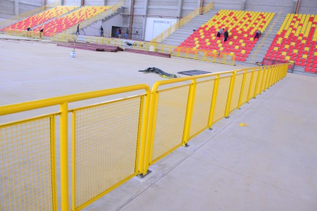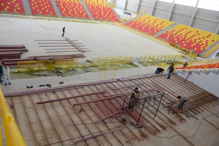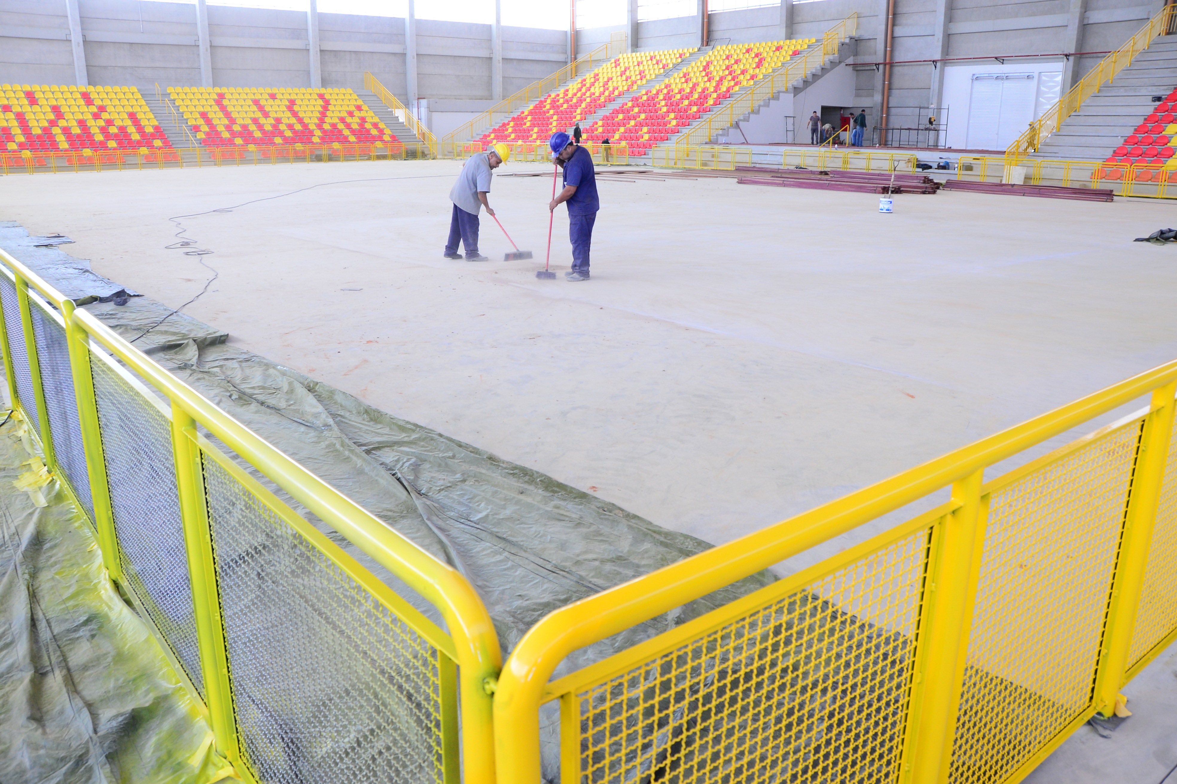 A quadra já recebeu o guarda-corpo (gradil) que separa os atletas dos torcedores. A previsão é a de que o piso seja colocado na próxima semana.
