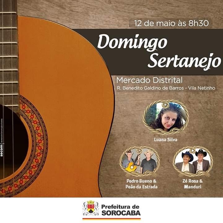 Realizada pela Prefeitura de Sorocaba, por meio da Secretaria da Cultura (Secult) e da Secretaria de Abastecimento, Agricultura e Nutrição (Seaban), o Domingo Sertanejo acontece todo segundo domingo do mês e tem como objetivo valorizar os artistas da cidade e da região.