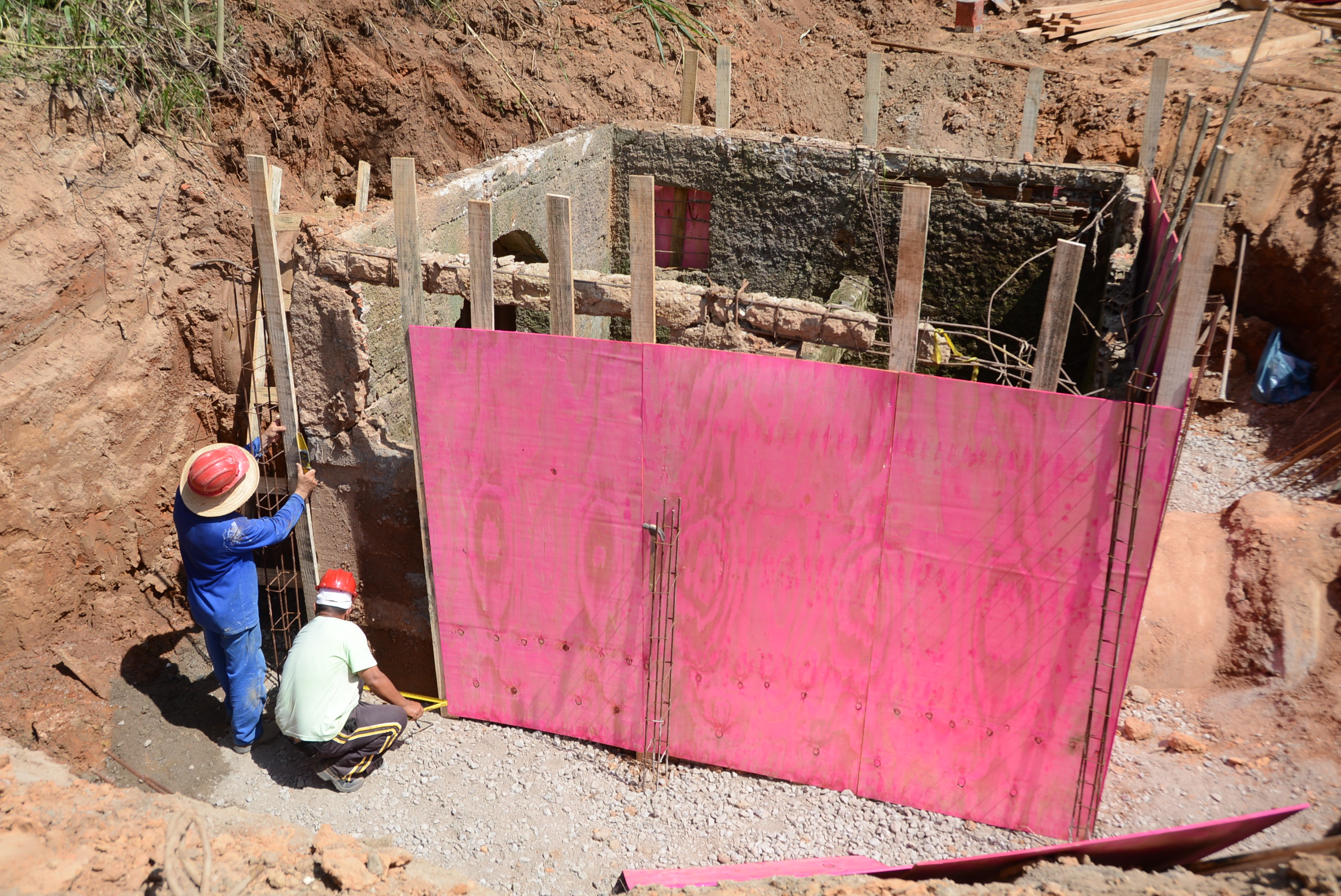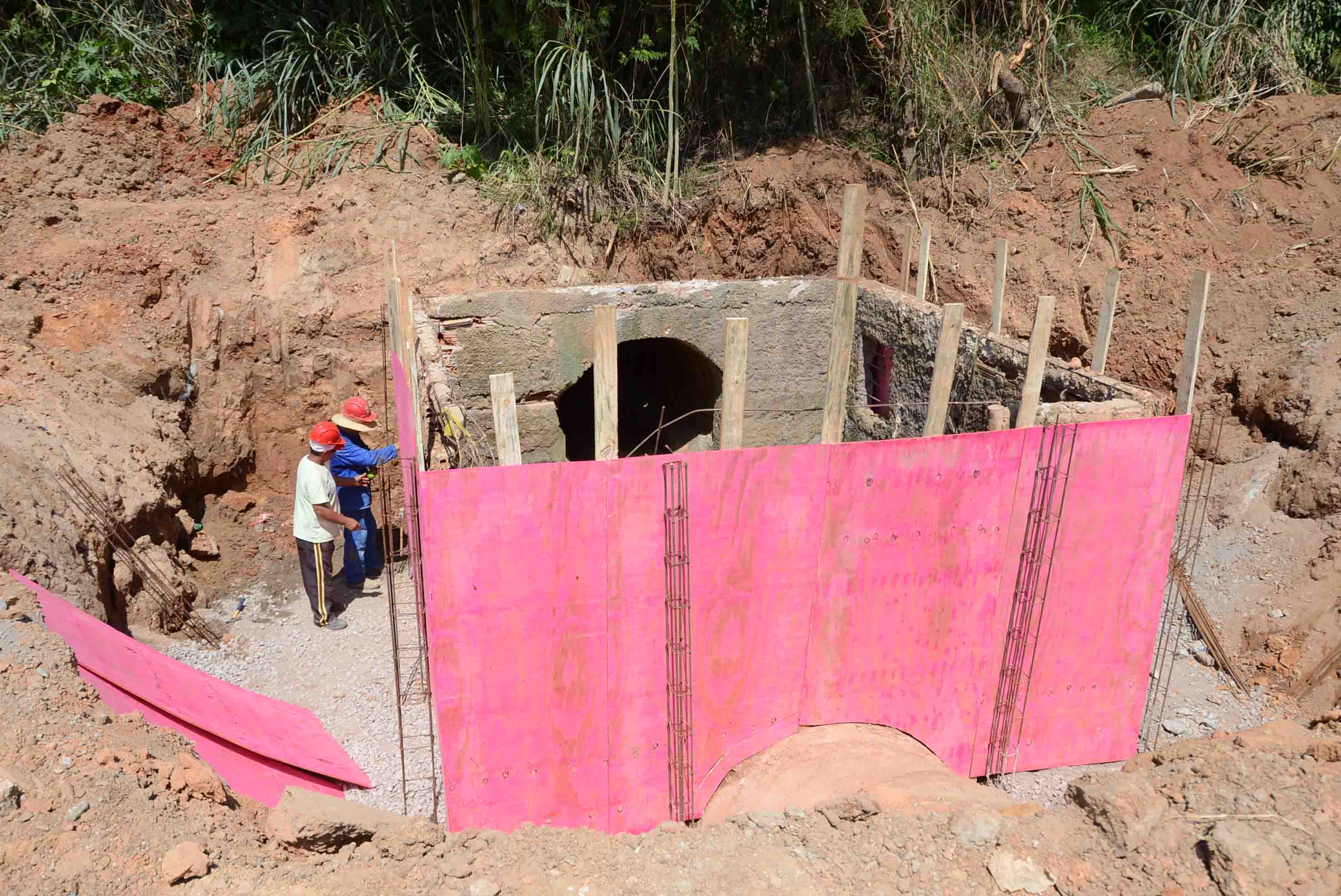 Funcionários trabalham na construção de uma caixa coletora de esgoto