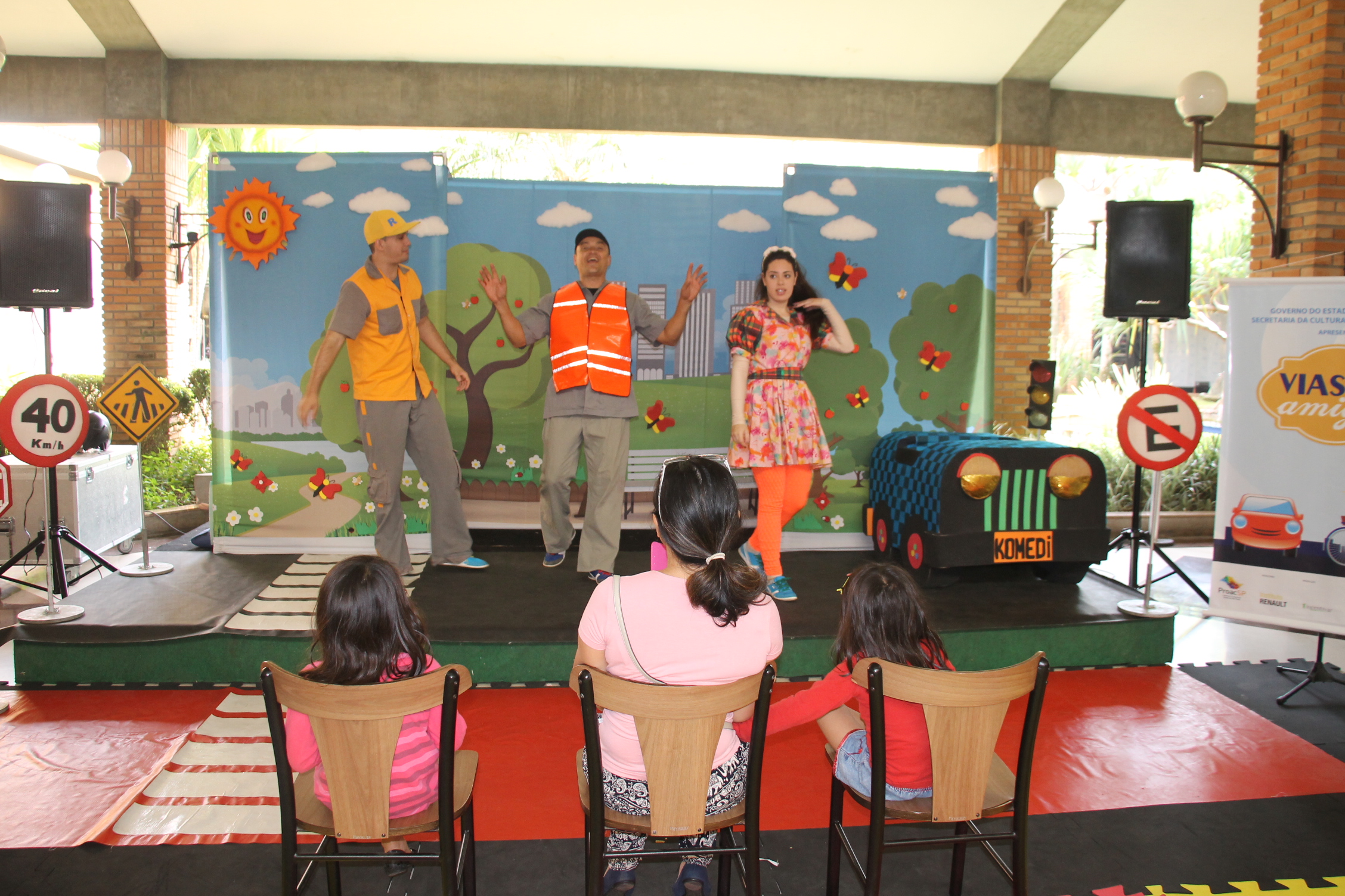 Descrição: Voltada ao público infantil, a peça “Vias Amigas” aborda a educação no trânsito de maneira lúdica, contribuindo para a formação crítica da criança. A apresentação aborda conceitos de cidadania, educação, transporte, leis do trânsito, e a preservação do meio ambiente.