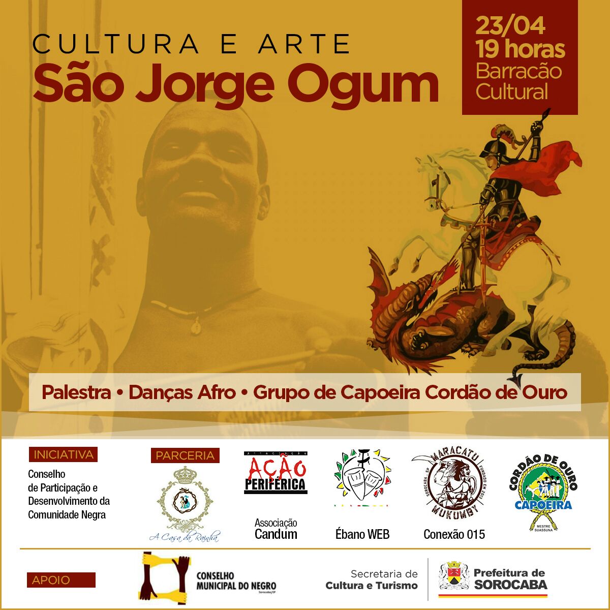 Na segunda-feira (23), quando é comemorado o Dia de São Jorge e o Dia de Ogun, o Conselho Municipal de Participação e Desenvolvimento da Comunidade Negra de Sorocaba (CMPDCN) realizará o evento “Cultura e Arte São Jorge Ogum” no Barracão Cultural. O evento terá início às 19h e contará com palestra e apresentações de dança afro e do grupo de capoeira Cordão de Ouro.