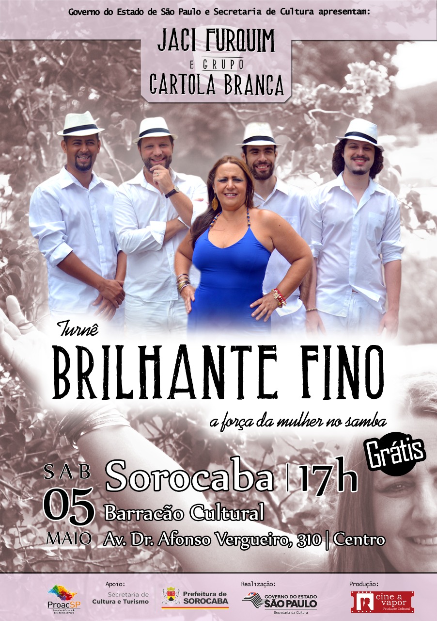 Os admiradores do samba poderão assistir gratuitamente neste sábado (5), às 17h, o show da Jaci Furquim e o grupo Cartola Branca no Barracão Cultural. O evento faz parte da turnê ‘Brilhante Fino’, que tem como tema a força da mulher no samba, e está sendo viabilizado em Sorocaba pelo ProAC (Programa de Ação Cultural) do Governo do Estado de São Paulo, com apoio da Prefeitura de Sorocaba, por meio da Secretaria da Cultura e Turismo (Secultur).