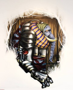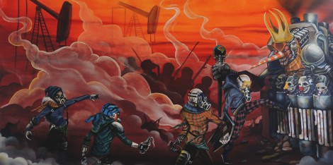 As telas e acrílicos possuem desenhos de máscaras, que simbolizam a adaptação que o ser humano é capaz de fazer, a tecnologia é mostrada como pontos em que uma vida é acabada quando uma máquina começa. Os trajes dos personagens traz elementos que nota-se a trajetória do homem em diversas épocas e por fim, o mundo em que foram retratados pertencem ao irreal, em que interagem com sentimentos e impressões da realidade mas transformados dentro dos limites racionais, técnicos e sonhos.