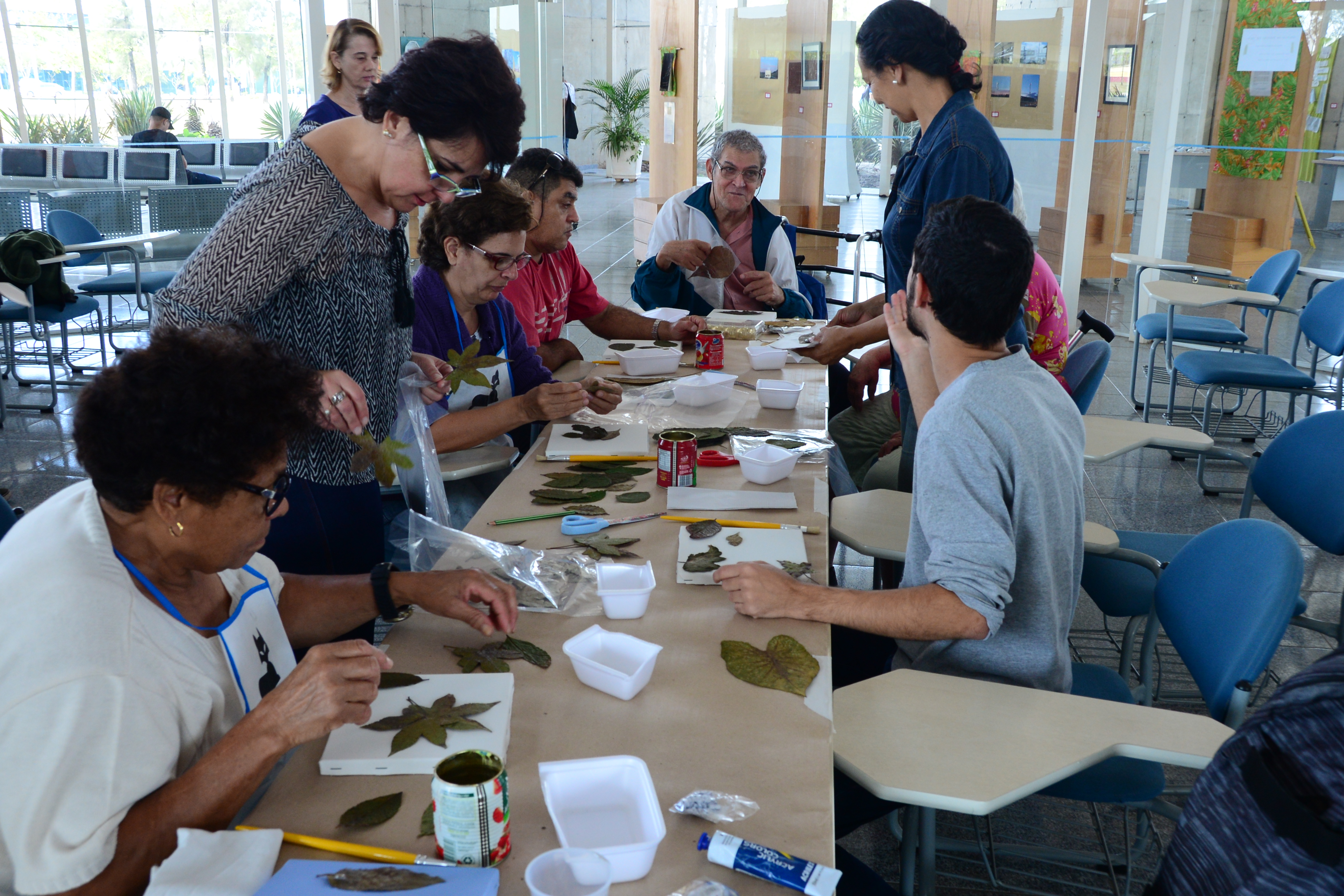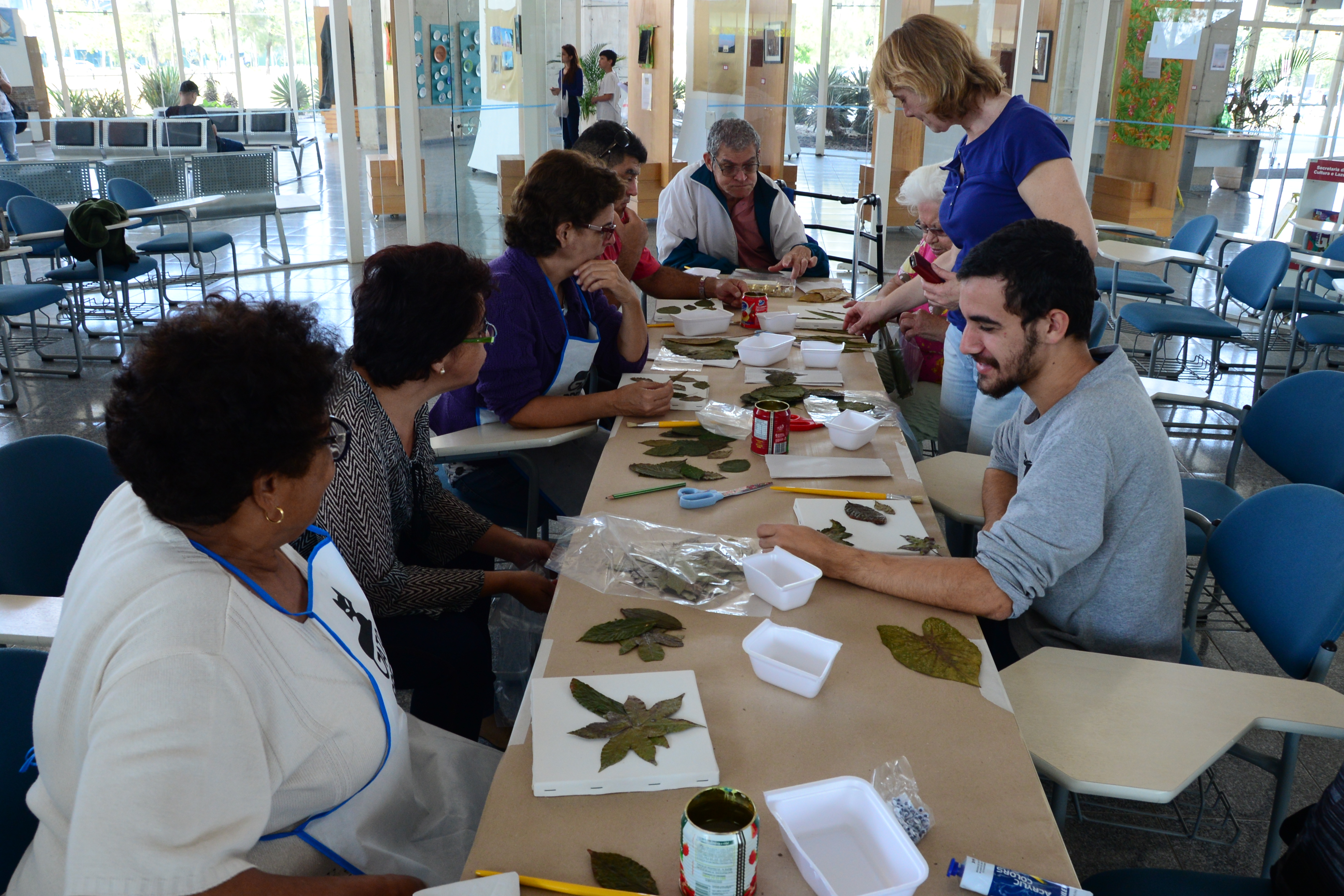 Junto dos trabalhos de Santos, seguem no espaço até 19 de agosto outros produzidos por aqueles que participam da oficina de Pintura em Tela, oferecida às segundas e terças-feiras, das 13h30 às 17h no Centro Integrado de Apoio à Pessoa com Deficiência (CIAPPD), da Secretaria de Desenvolvimento Social (Sedes). Nesta segunda, em especial, a aula aconteceu na própria Biblioteca Municipal, podendo ser frequentada por qualquer pessoa que fosse visitar o local.