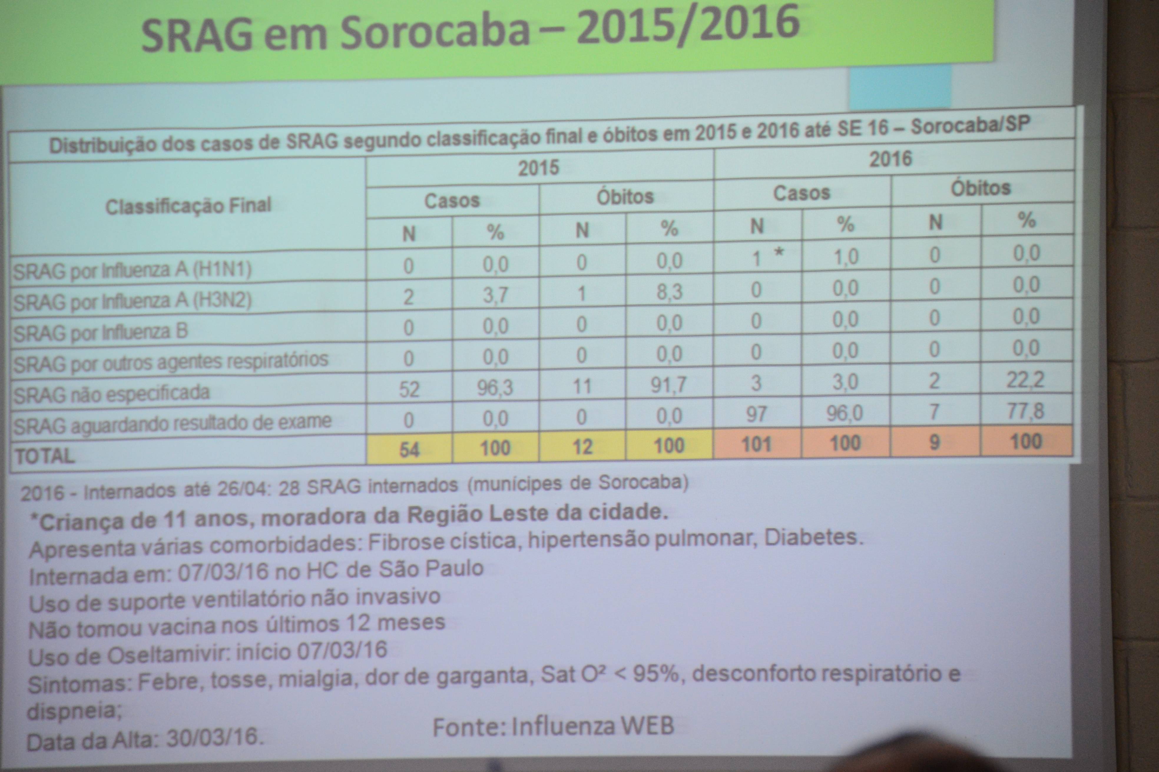 Conforme boletim epidemiológico divulgado nesta quinta-feira (28) pela SES, Sorocaba tem 101 casos de Síndrome Respiratória Aguda Grave (SRAG) registrados em 2016. Destes, 97 estão no aguardo de resultado para constatar a causa, 03 tiveram causa não especificada e um refere-se a criança de 11 anos em que foi constatado o vírus Influenza A H1N1. Trata-se de moradora da região leste da cidade que apresenta várias comorbidades (fibrose cística, hipertensão pulmonar e diabetes), ficou internada no Hospital das Clínicas, em São Paulo, e já recebeu alta médica.