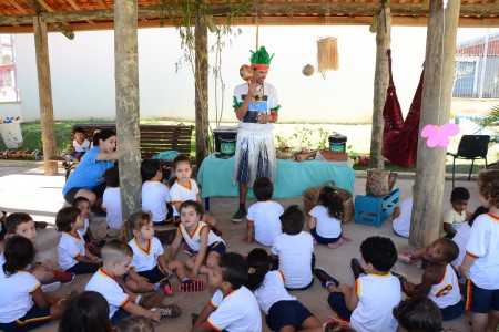 Bióloga do Sítio Reino Animal, Mariana apresentou aos pequenos como é a alimentação dos índios, seus costumes, as músicas e também suas vestimentas. Para isso, contou com a ajuda do Danilo, um voluntário que se caracterizou de índio a fim de deixar o momento mais lúdico e, assim, prender a atenção das crianças.