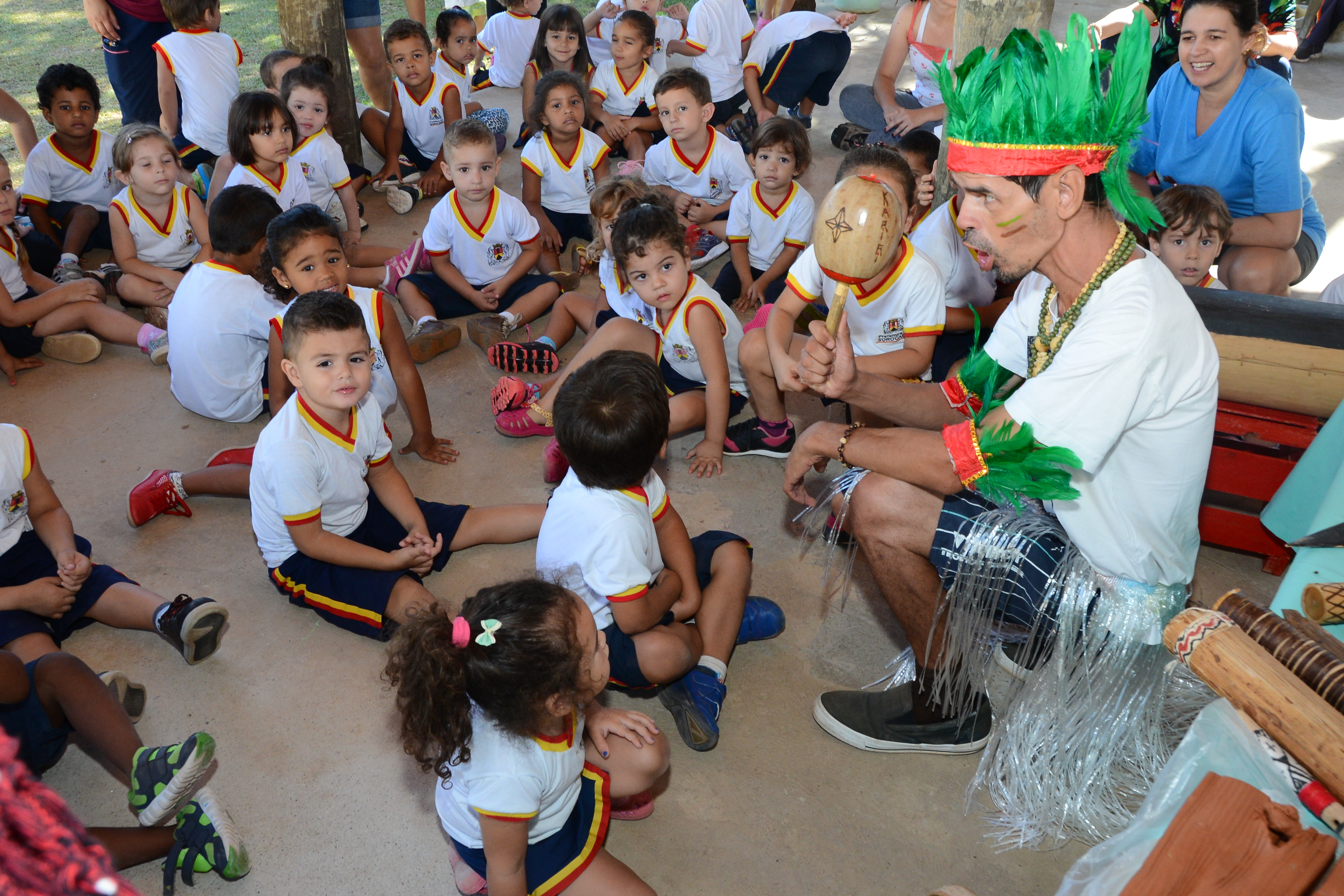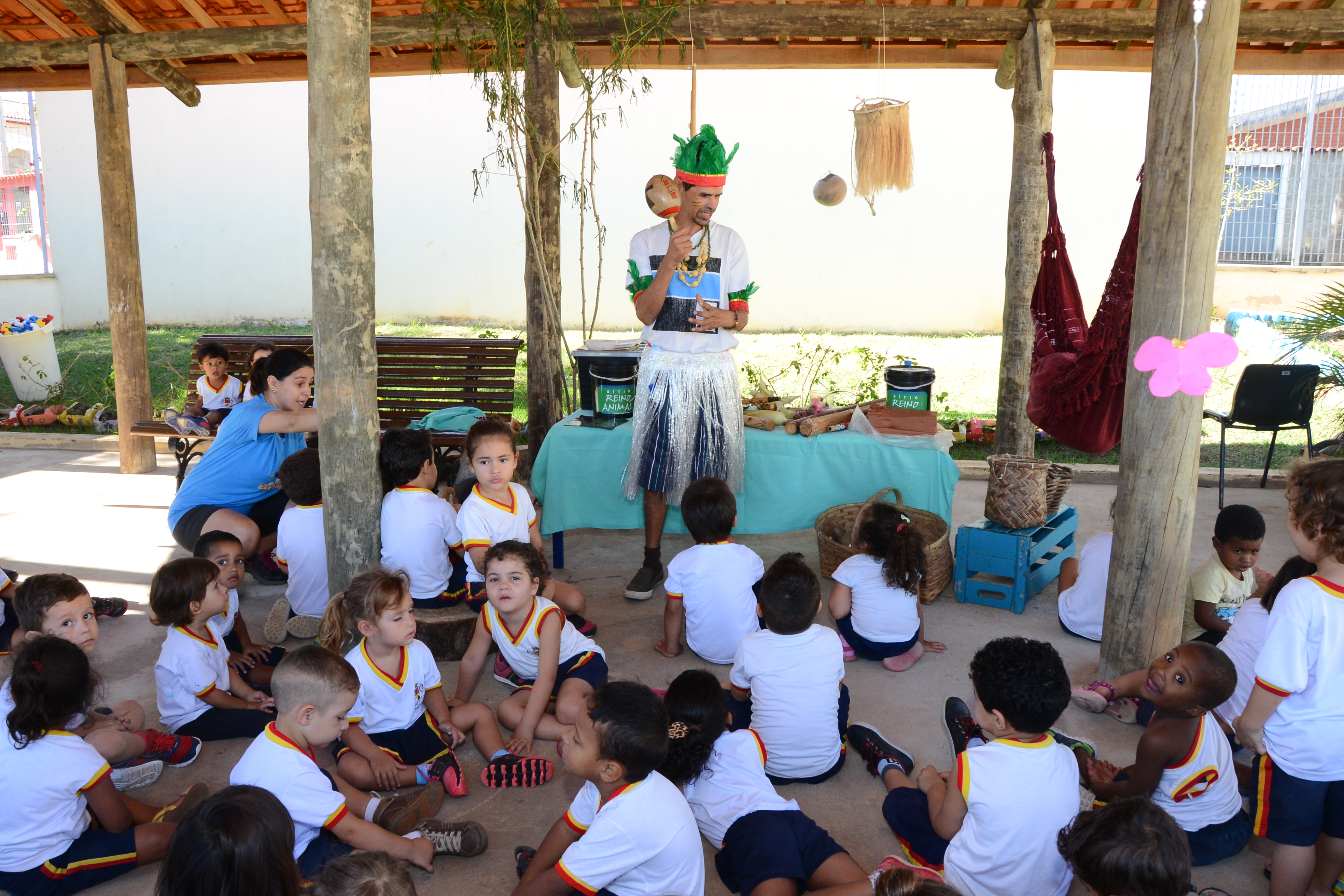 A terça-feira (19) começou diferente no Centro de Educação Infantil “Dolores Cupiam do Amaral”, o CEI 23, localizado no Jardim dos Estados. Em vez de passar a manhã na sala de aula, as crianças ficaram no quiosque do parque. Sentados, eles ouviam atentamente a explicação da bióloga Mariana Parra, que mostrava diversos elementos da cultura indígena. A atividade integra o calendário especial em alusão ao Dia do Índio, comemorado nesta data.