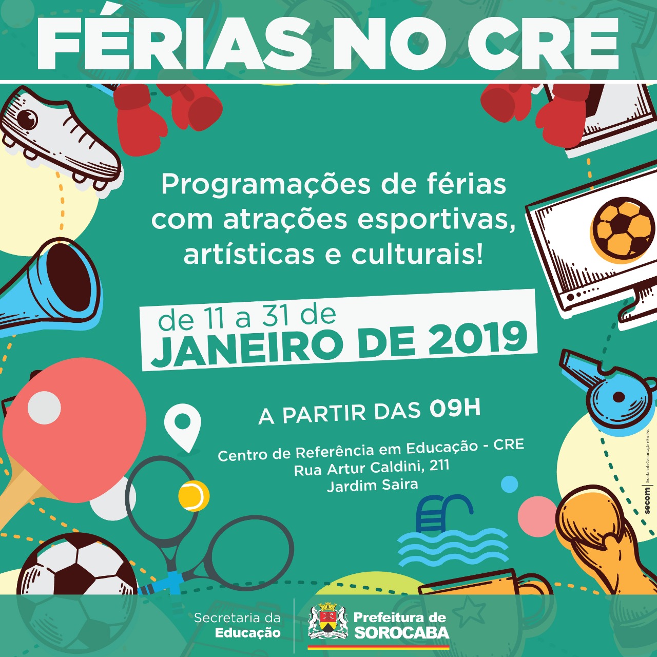 O Centro de Referência em Educação (CRE), que fica localizado na Rua Artur Caldini, 211 no Jardim Saira, terá uma programação repleta de atrações gratuitas no mês de janeiro. A ação ‘Férias no CRE ofertada à população pela Prefeitura de Sorocaba, por meio da Secretaria da Educação (SEDU), contará com diversas atrações esportivas, artísticas e culturais e será realizada entre os dias 11 e 31 de janeiro de 2019.