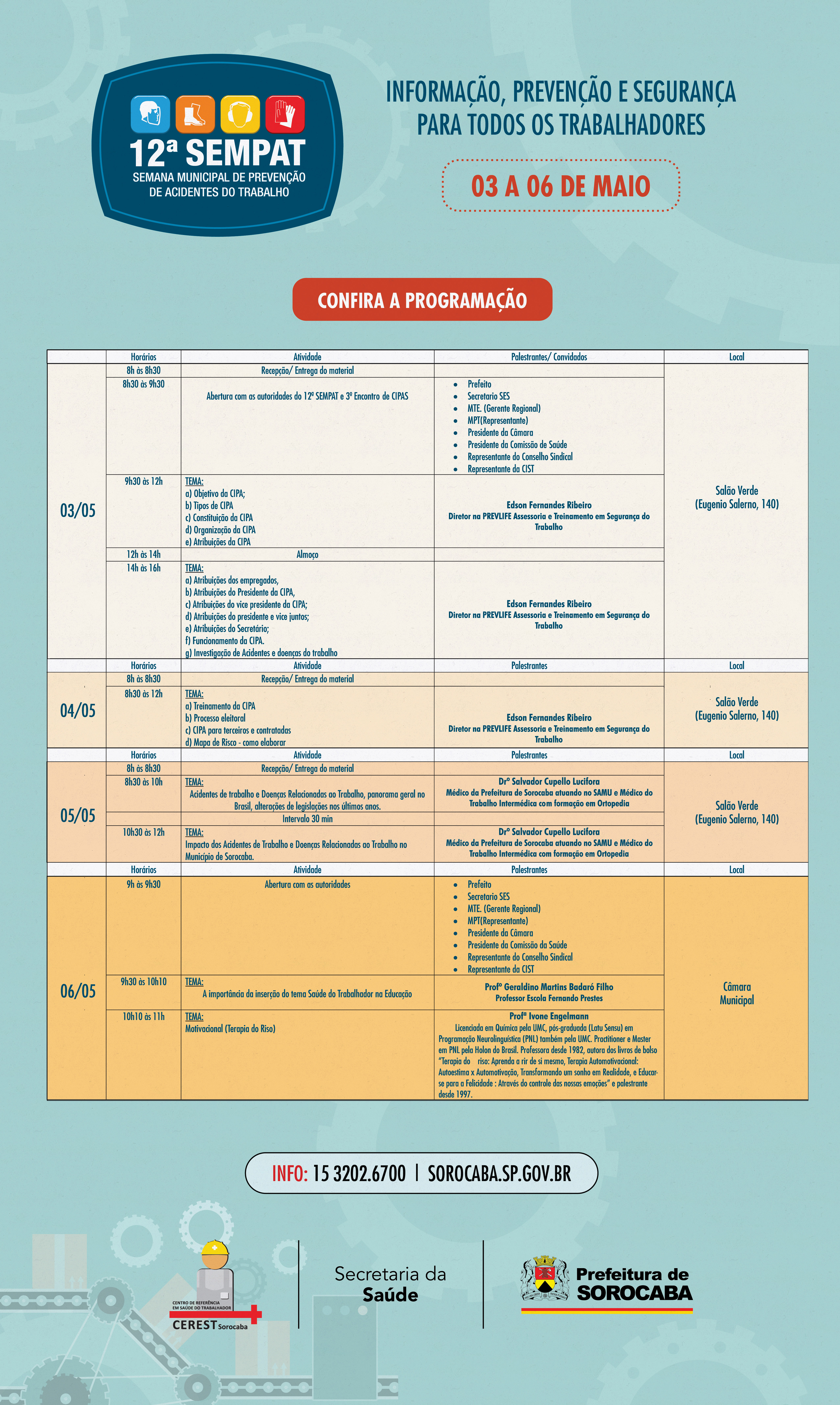 O Centro de Referência em Saúde do Trabalhador em Sorocaba (CEREST), vinculado à Secretaria da Saúde (SES), e o Ministério Público do Trabalho de Sorocaba realizam a 12ª Semana Municipal de Prevenção de Acidentes do Trabalho (SEMPAT), a partir desta terça-feira (3). Dentro da programação, ainda ocorrerá o 3º Encontro Regional de CIPAS. As empresas interessadas em participar podem se inscrever gratuitamente pelo link https://credencial.imasters.com.br/sempat-2016-sorocaba