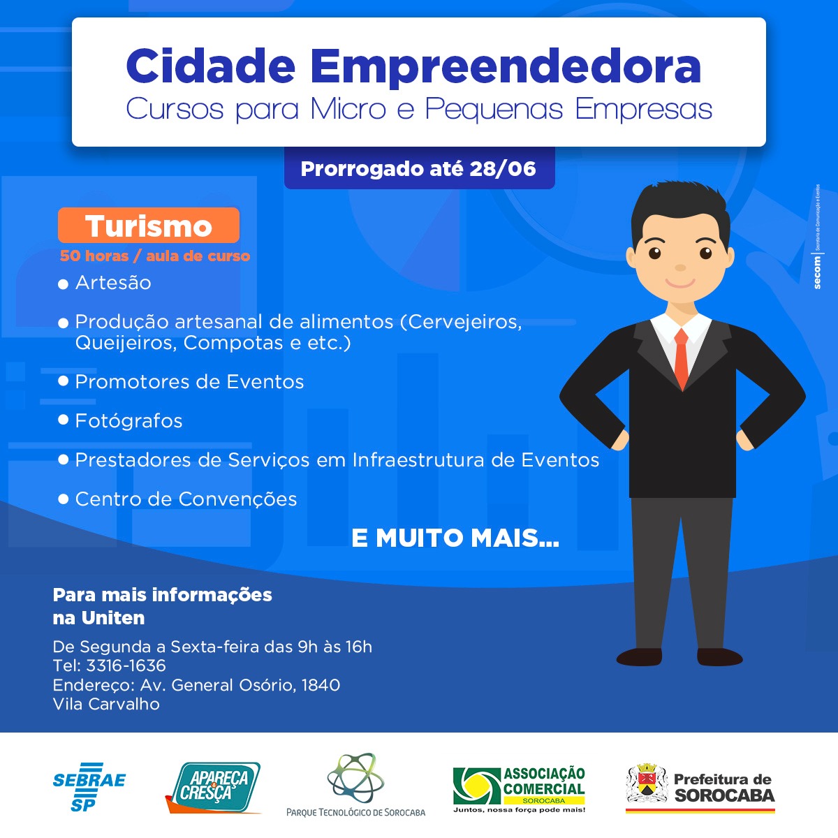 Os Microempreendedores Individuais (MEIs) interessados no curso gratuito de Turismo oferecido pelo programa “Cidade Empreendedora”, têm até sexta-feira (28) para se inscrever. As inscrições podem ser online, no link https://tinyurl.com/y4ber2js, ou presencialmente na Universidade do Trabalhador, Empreendedor e Negócios (Uniten), localizada na avenida General Osório, 1.840, Altos do Trujillo. Entre os documentos, é necessário apresentar no momento da inscrição, o certificado de condição de MEI ou cartão de CNPJ, além do RG, CPF e comprovante de residência.