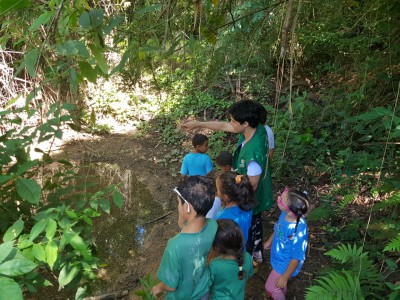 De início as crianças tiveram um bate papo onde foram passadas as perguntas a serem descobertas por elas, logo em seguida, receberam um mapa do Parque onde localizaram um possível local da nascente e fizeram uma trilha até o lugar.