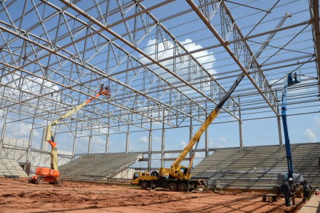De acordo com o engenheiro Antônio Carlos Incau de Almeida, da Progredior, empresa responsável pela construção da Arena, nesta semana está sendo concluído o serviço de travamento e contravento das estruturas metálicas. Ele explica que na sequência começa a instalação das telhas metálicas com enchimento em Poliuretano (PU). Quando finalizada, a cobertura terá 240 toneladas de metal, incluindo os fechamentos laterais e superior. O engenheiro informa ainda que o fechamento da lateral superior será em telha com venezianas translúcidas.