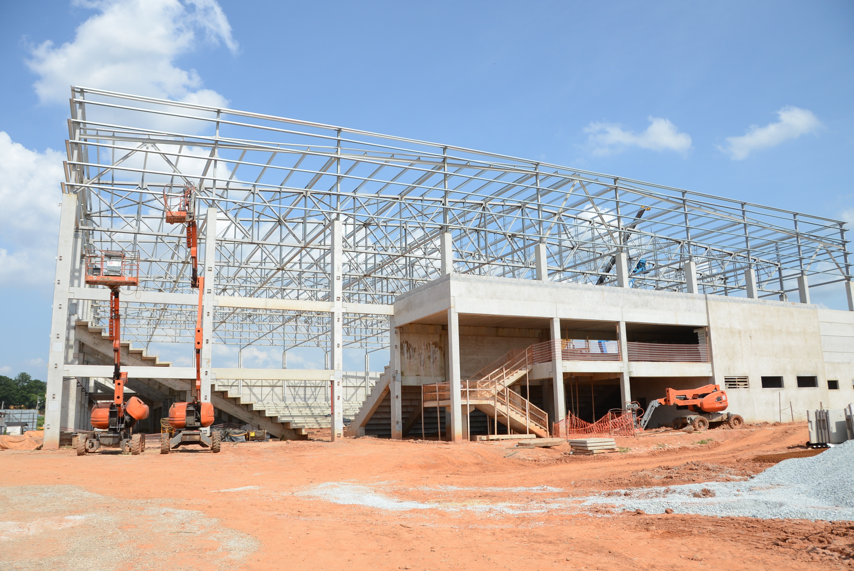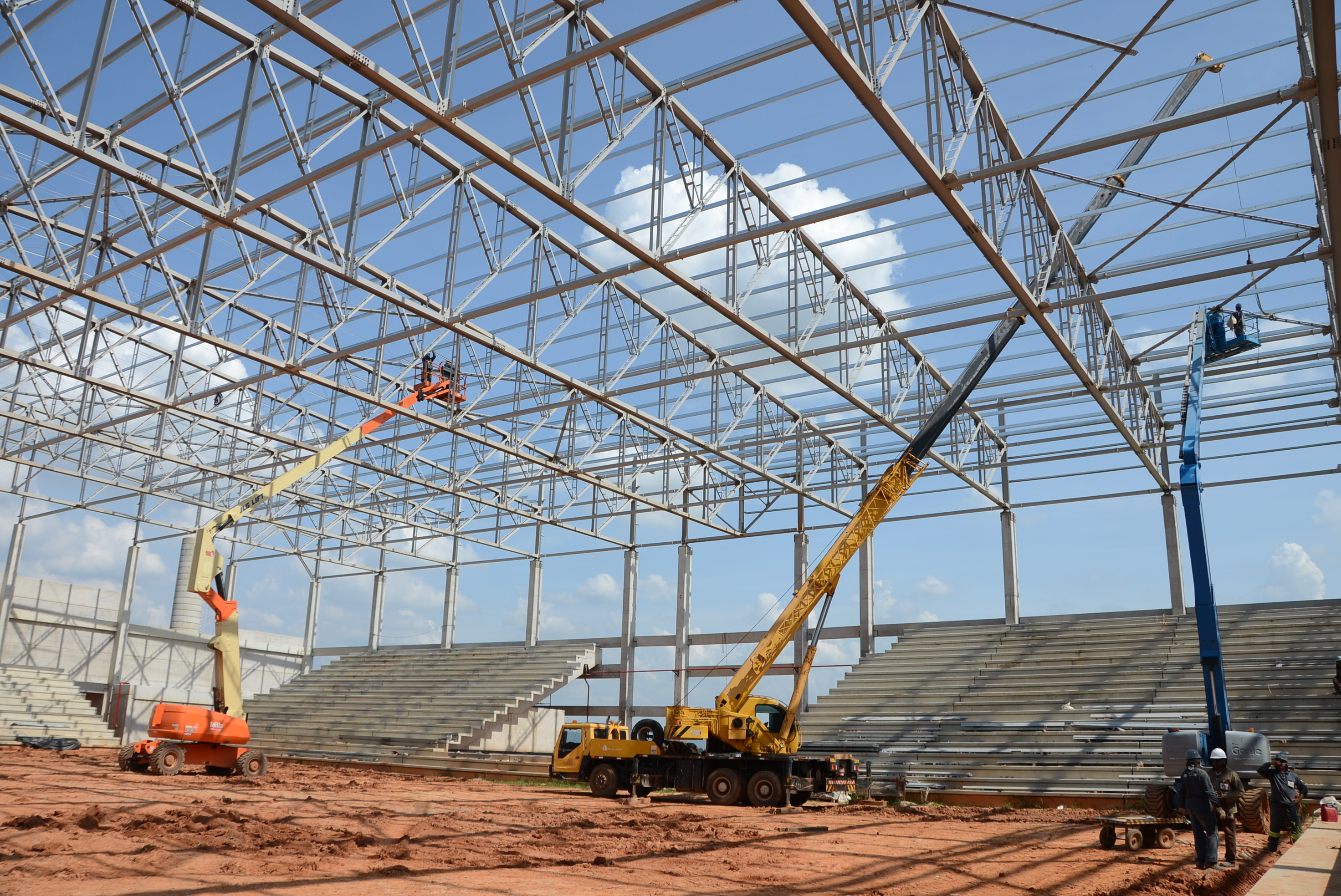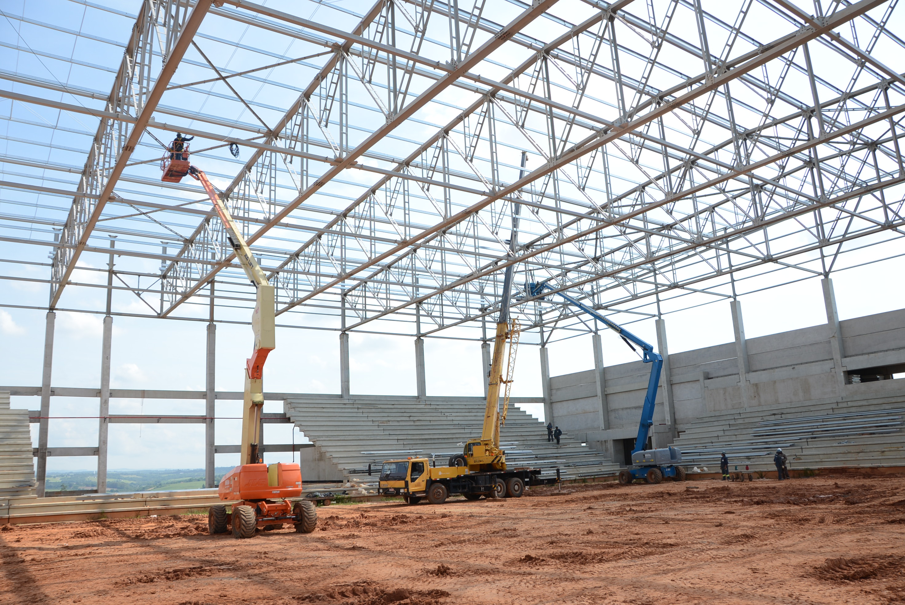 Seguem em ritmo acelerado as obras de construção da Arena Multiúso. Nesta semana, a empresa responsável está concluindo o travamento da estrutura do telhado. A partir dos próximos dias, começa a instalação dos cinco mil metros quadrados de telhas metálicas. Ao lado do futuro espaço, maquinário trabalha na abertura da via de acesso. As obras são realizadas pela Prefeitura de Sorocaba, por meio da Secretaria de Mobilidade, Desenvolvimento Urbano e Obras (Semob).