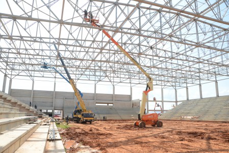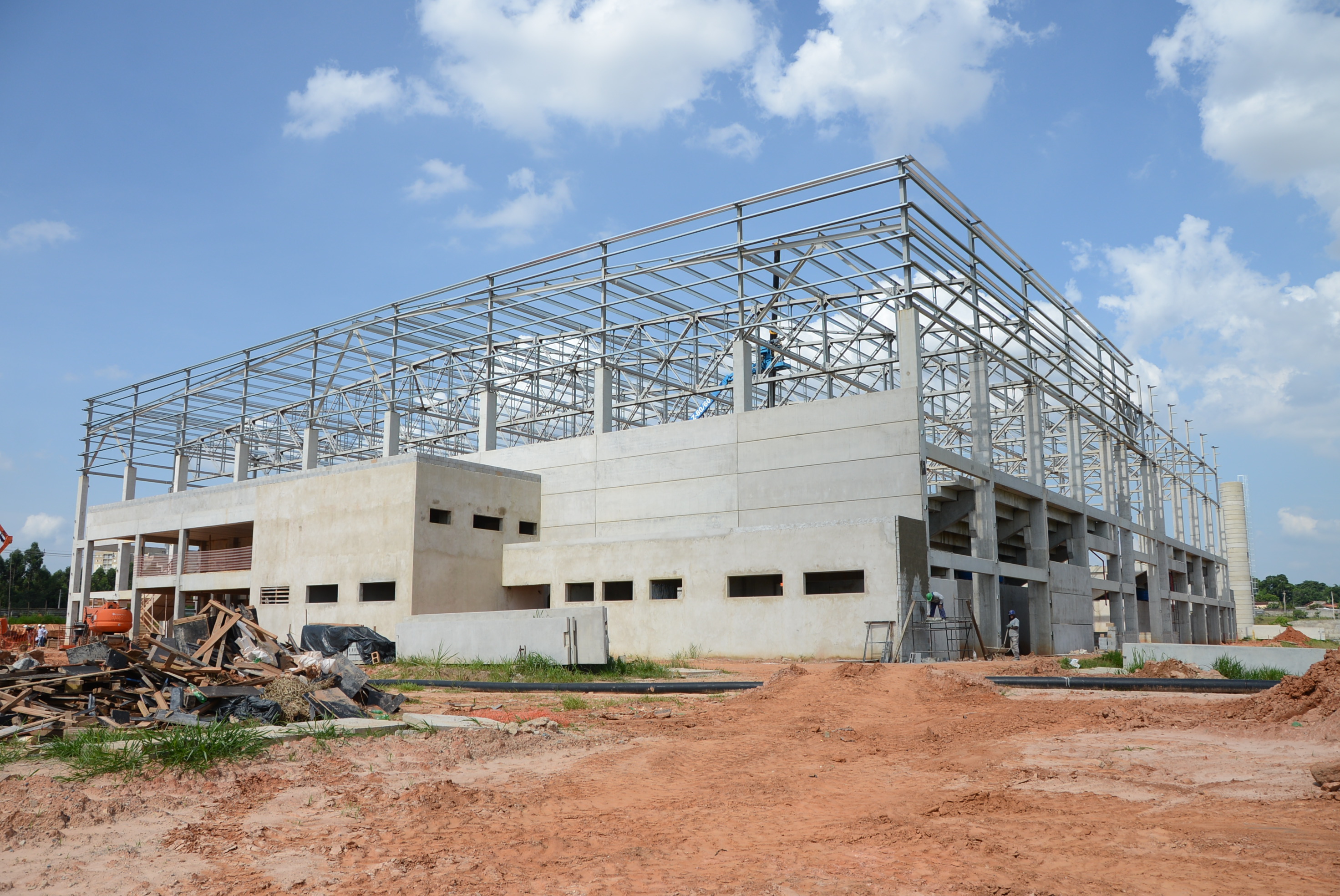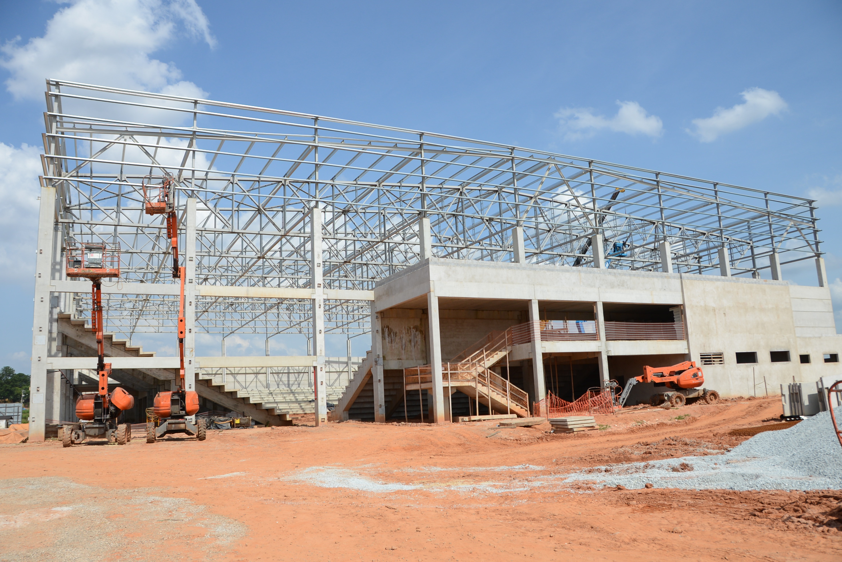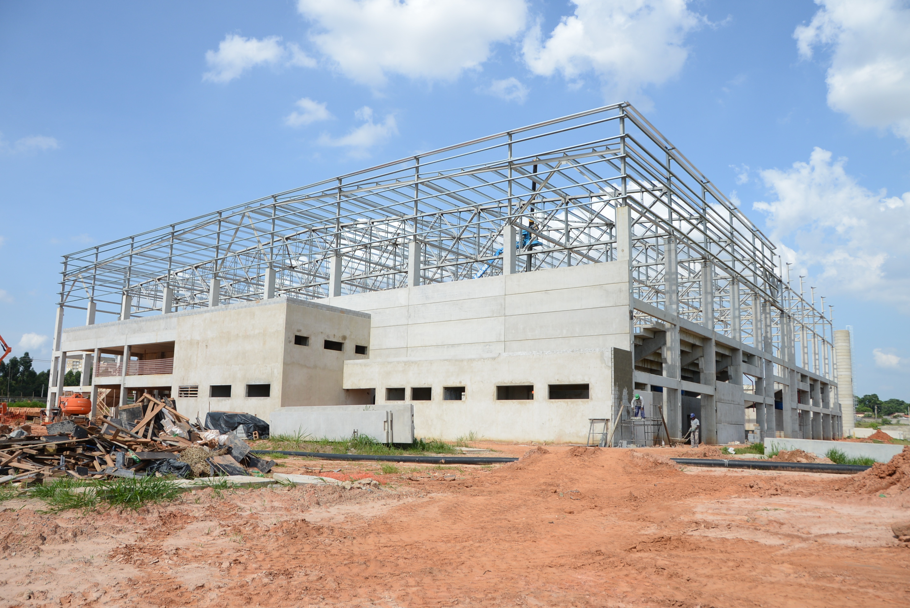 Seguem em ritmo acelerado as obras de construção da Arena Multiúso. Nesta semana, a empresa responsável está concluindo o travamento da estrutura do telhado. A partir dos próximos dias, começa a instalação dos cinco mil metros quadrados de telhas metálicas. Ao lado do futuro espaço, maquinário trabalha na abertura da via de acesso. As obras são realizadas pela Prefeitura de Sorocaba, por meio da Secretaria de Mobilidade, Desenvolvimento Urbano e Obras (Semob).