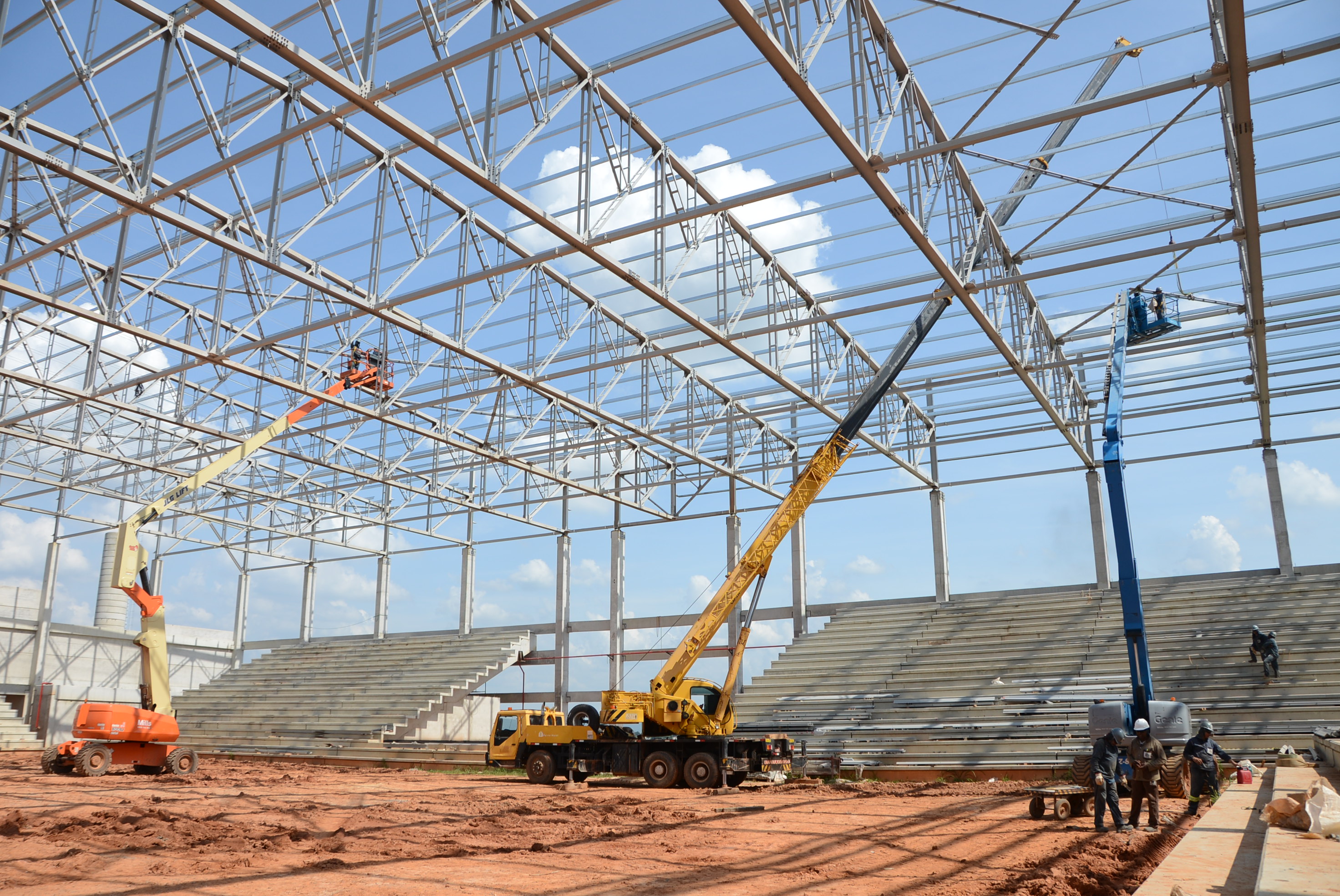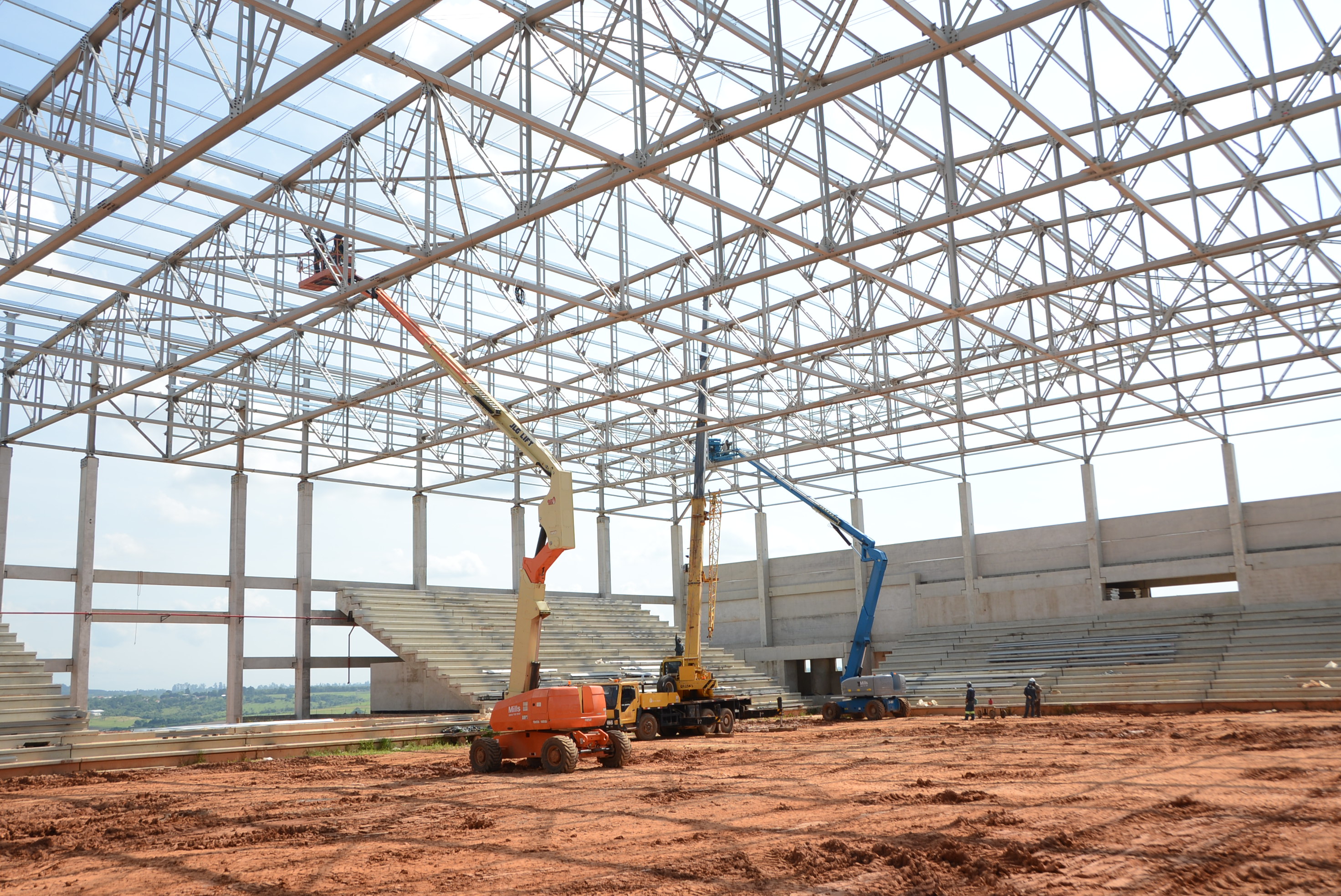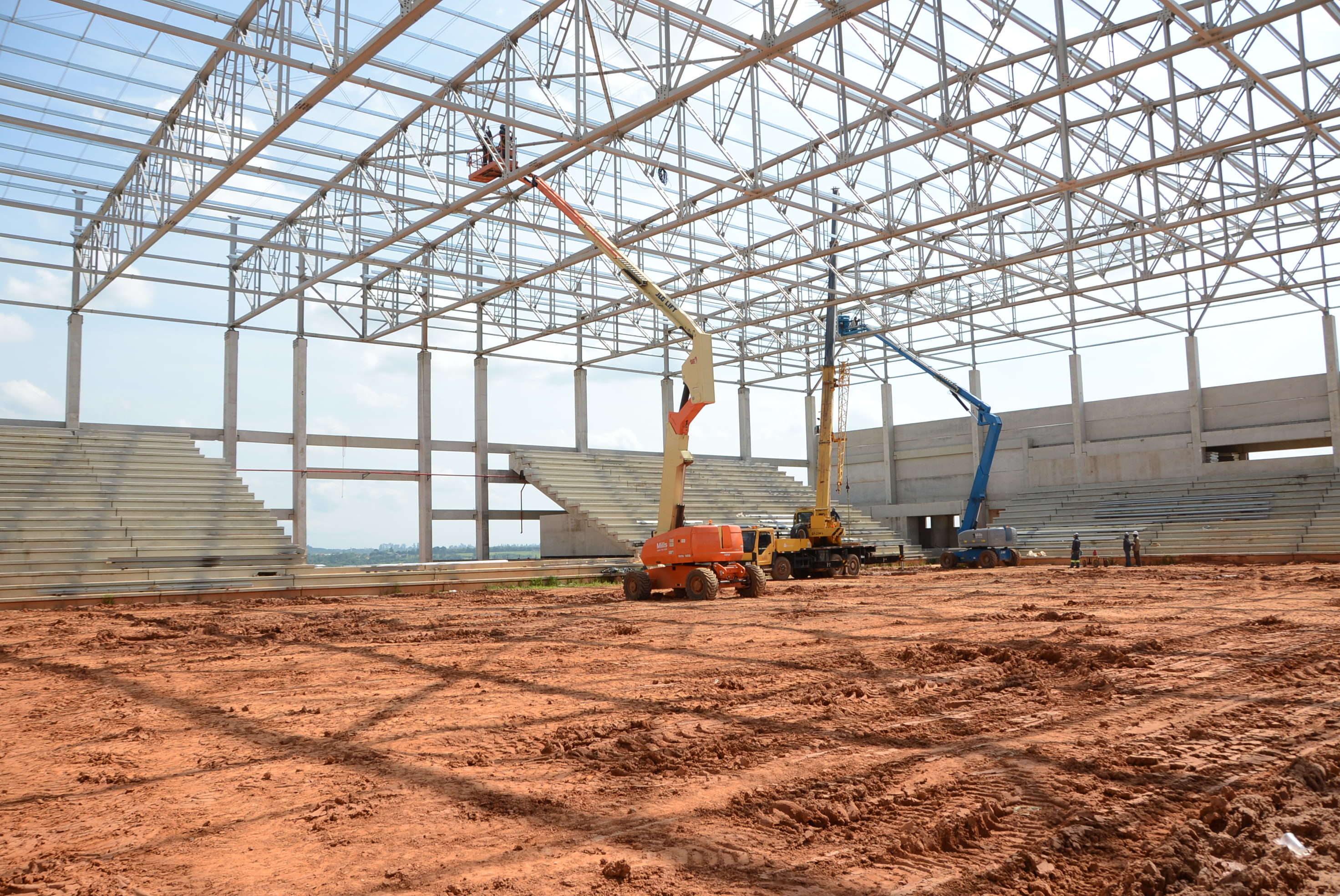 Paralelo à cobertura, há outras frentes de trabalho instalando a rede de incêndio, preparando a concretagem dos pisos dos banheiros para o público e atletas, dos vestiários, além do fechamento das laterais com placas de concreto, entre outros.