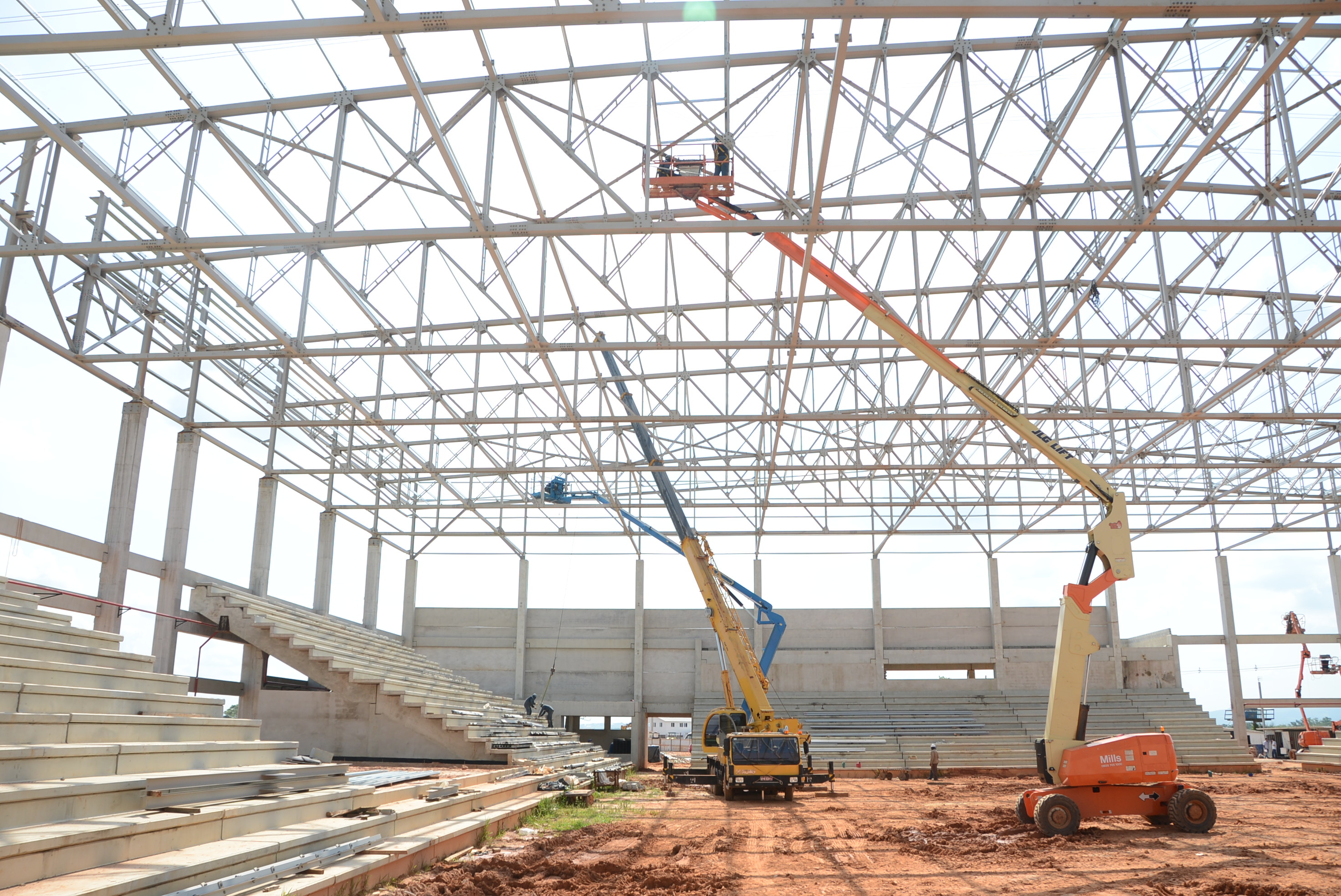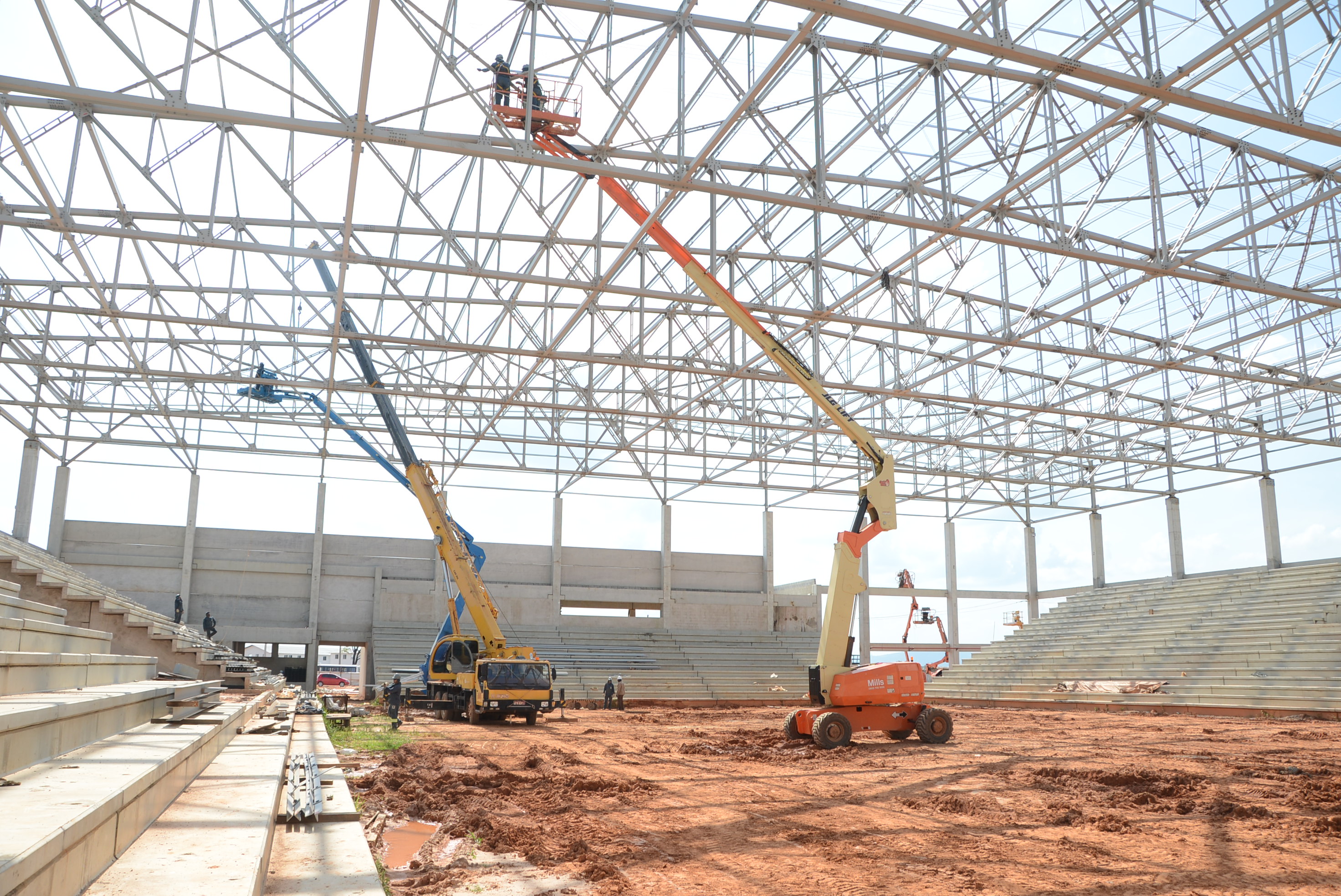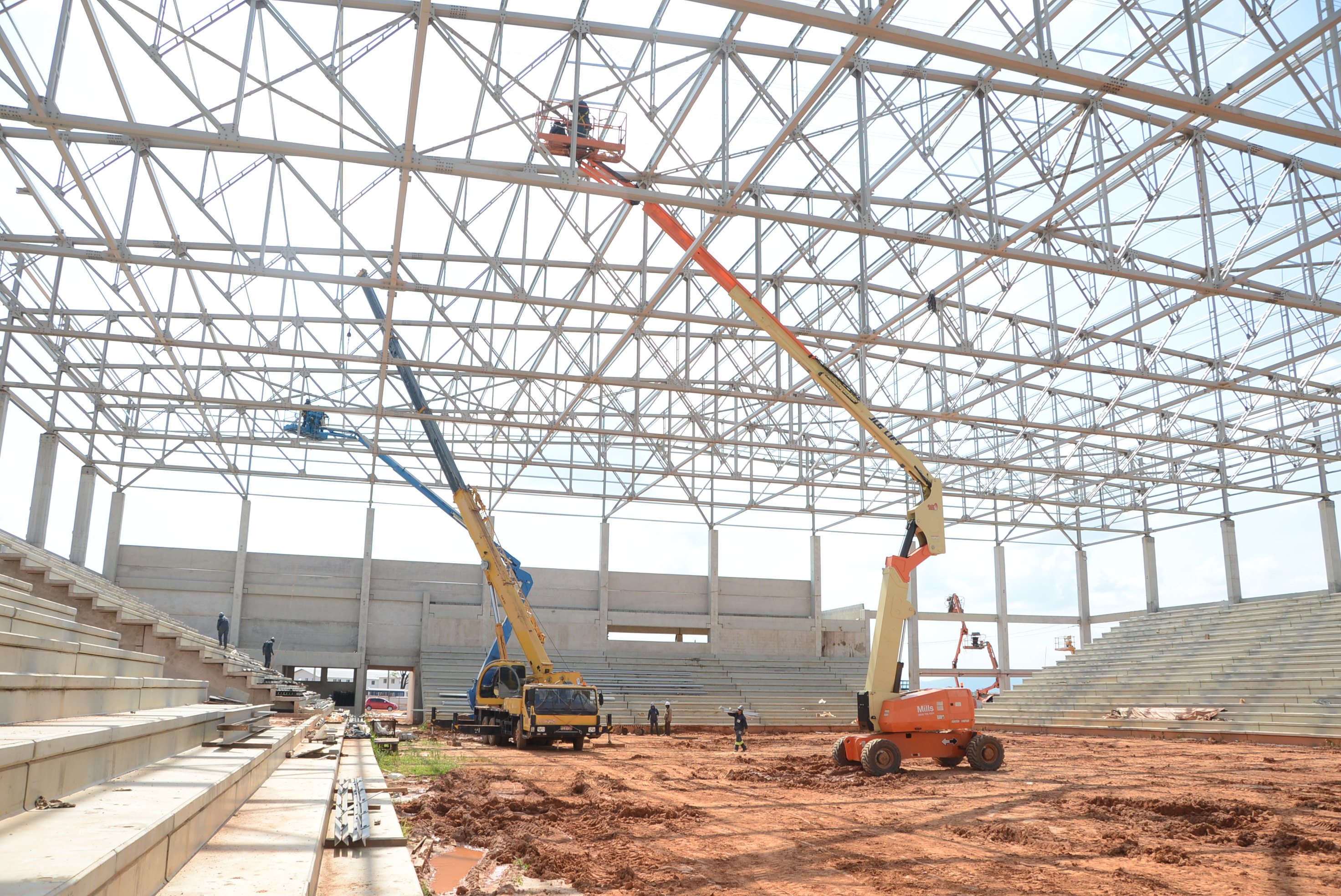Paralelo à cobertura, há outras frentes de trabalho instalando a rede de incêndio, preparando a concretagem dos pisos dos banheiros para o público e atletas, dos vestiários, além do fechamento das laterais com placas de concreto, entre outros.
