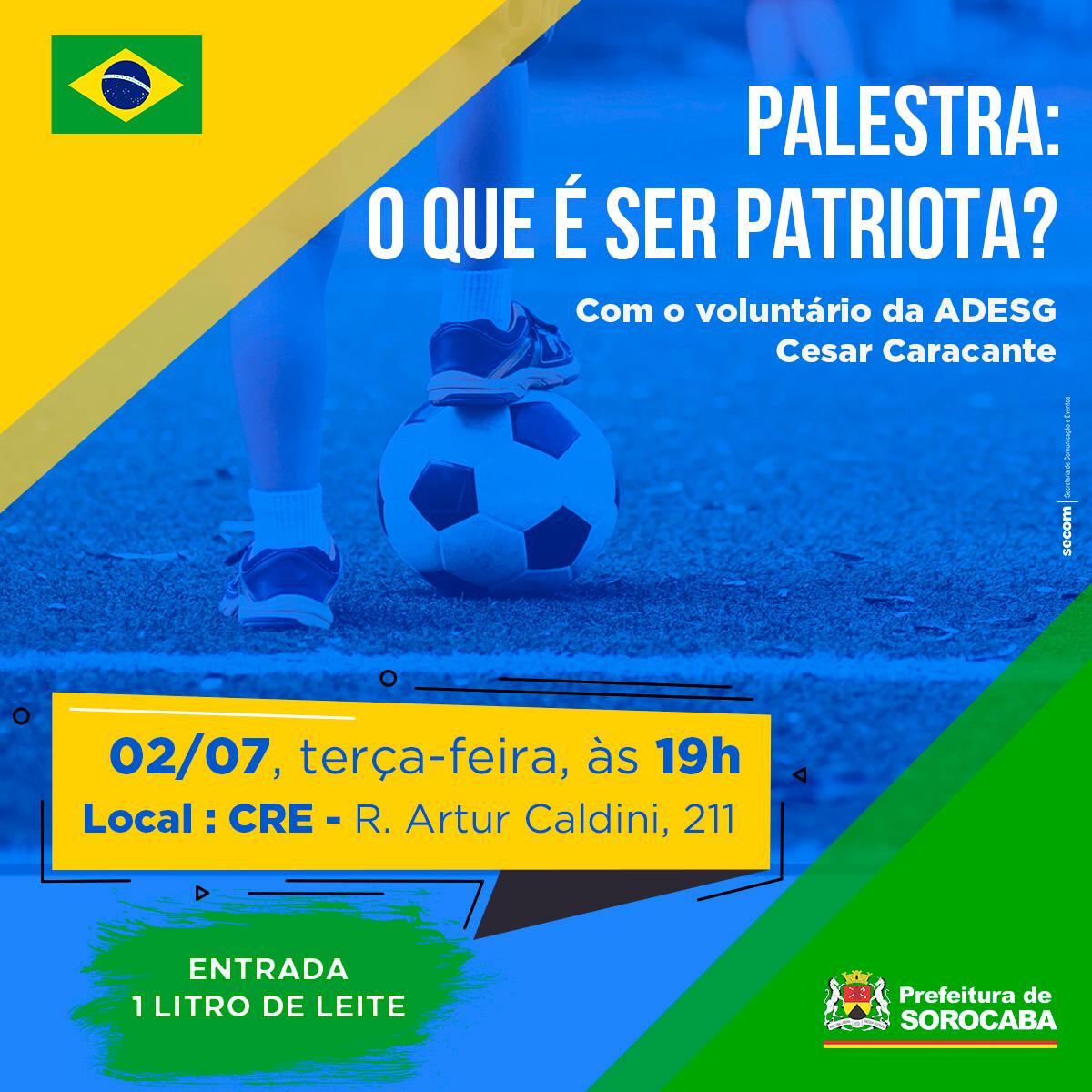 O Centro de Referência em Educação (CRE) recebe, no dia 2 de julho às 19h, o voluntário da Associação dos Diplomados da Escola Superior de Guerra (ADESG), Cesar Caracante, com a palestra: “O que é ser patriota? – O caminho certo para o progresso pessoal e qualidade de vida”. O evento é aberto ao público e a entrada é 1 litro de leite.