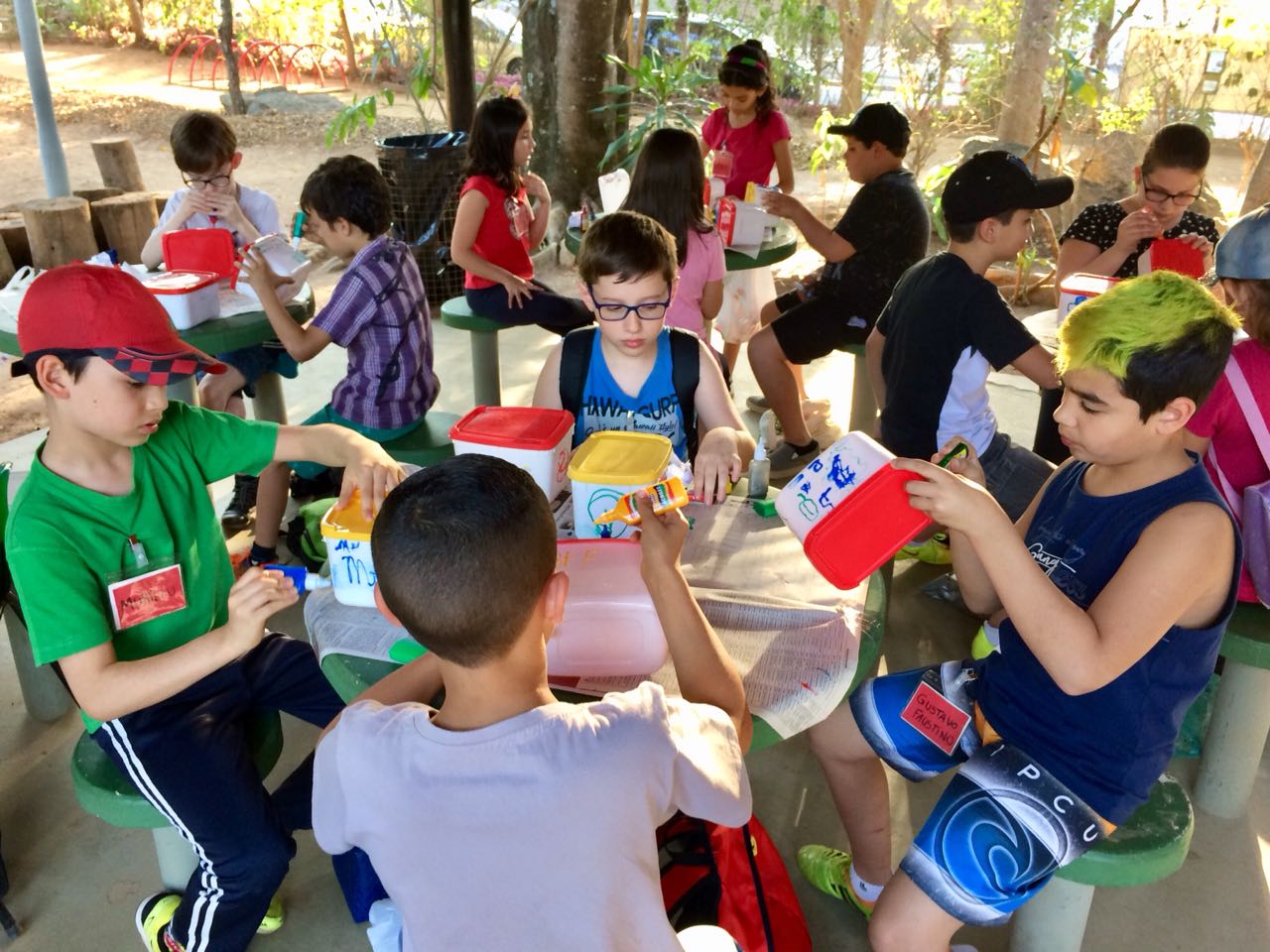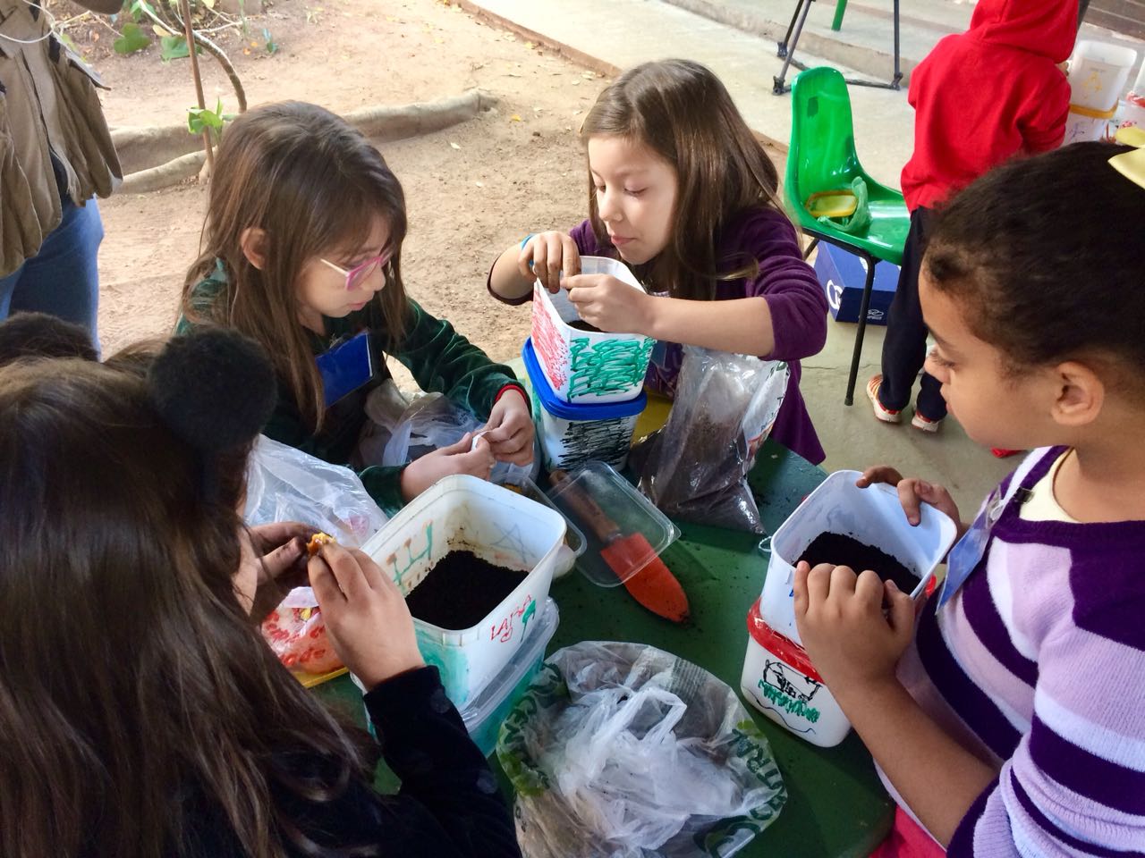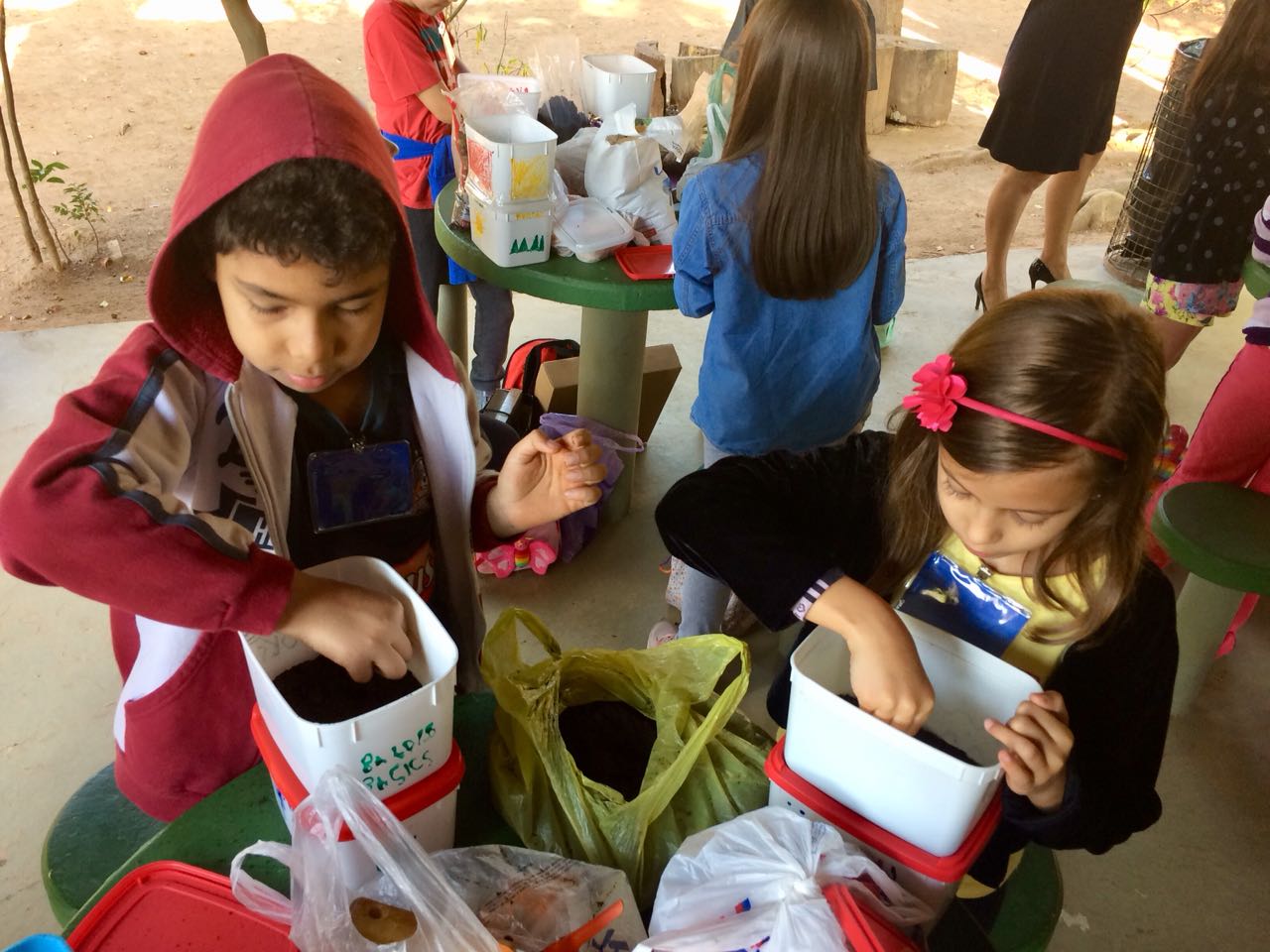Para confeccionar a composteira, as crianças reutilizaram potes de sorvete e o lixo orgânico de casa. Na oficina eles aprenderam a intercalar as camadas de terra, folhas secas e os restos de frutas, verduras e legumes. A compostagem doméstica é uma solução eficaz para reciclagem de lixo orgânico. Os restos de alimentos formam um composto de adubo, que pode ser usado em hortas, vasos e jardins sem nenhum custo.