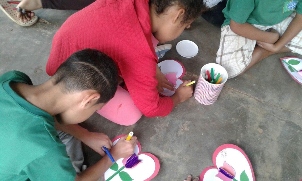 Cada criança fez um cartão especial em formato de flor e, utilizando tinta e muita criatividade, eles pintaram um vaso para dar a uma pessoa da família, seja mãe, madrasta, avó, tia, irmã mais velha ou outra pessoa que cuida deles com carinho.
