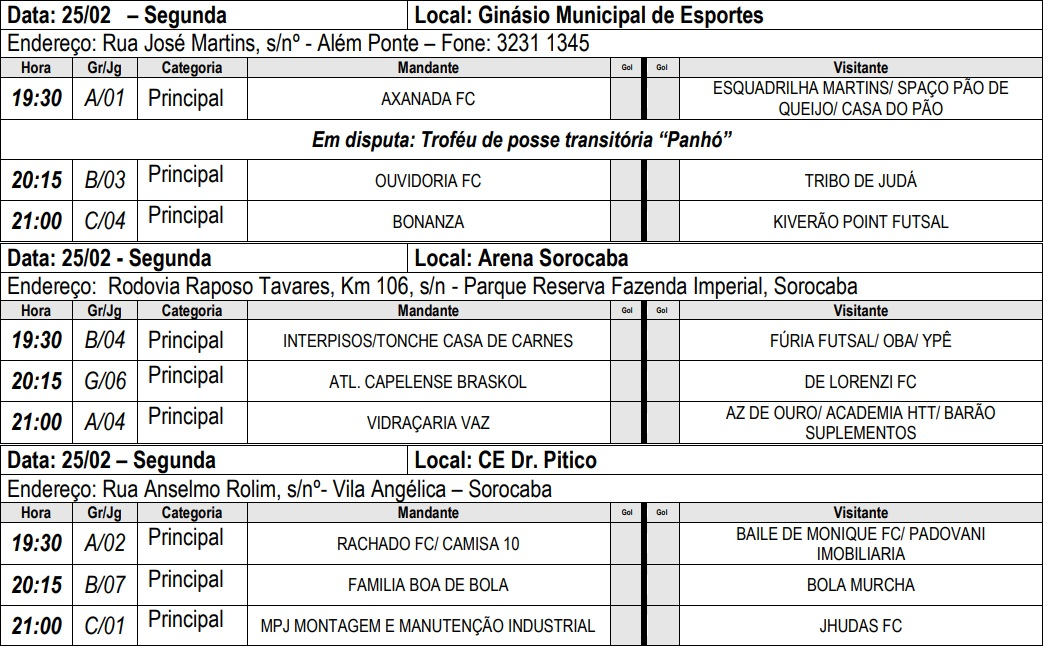Ginásio Municipal de Esportes ‘Dr. Gualberto Moreira’ – Rua Duarte Costa, 50, Vila Hortência. Telefone: (15) 3231-1345.