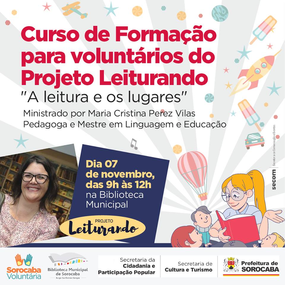 Nesta quarta-feira (7), das 9h às 12h, pessoas interessadas em participar do projeto Leiturando podem participar de um curso gratuito de formação na Biblioteca Municipal “Jorge Guilherme Senger”, no Alto da Boa Vista. A capacitação será oferecida pela pedagoga e mestre em Linguagem e Educação, Maria Cristina Perez Vilas.