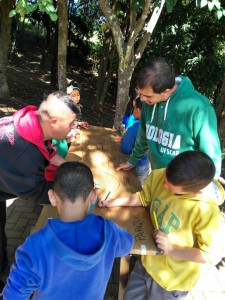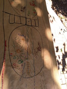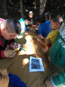 Em seguida, as crianças analisaram uma imagem de satélite da região e desenharam um “esqueleto” do córrego e colocaram no papel tudo o que observaram no entorno, desde animais, como peixes e aves, e o lixo.