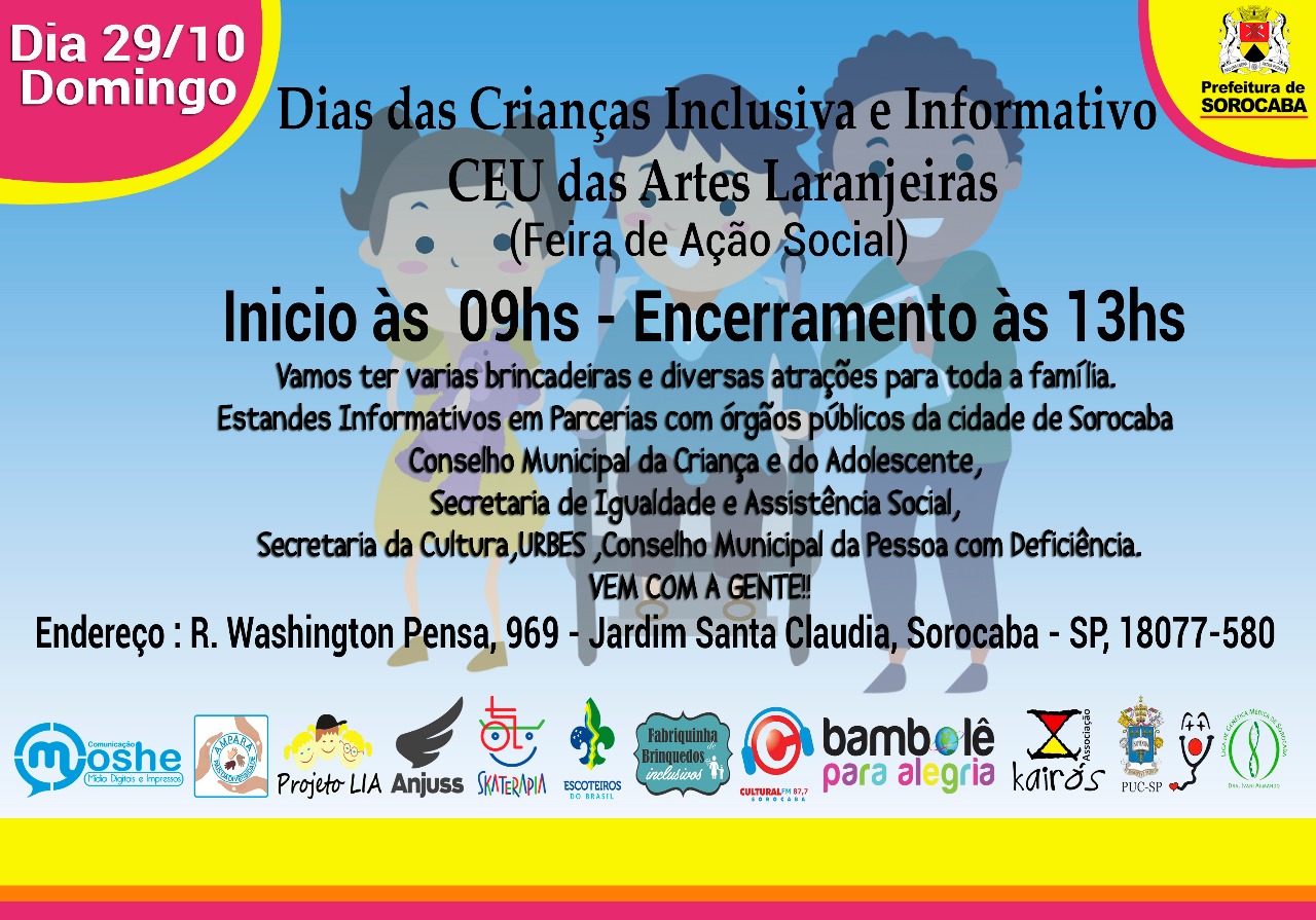 Será realizado neste domingo (29) o “Dia das Crianças Inclusivo e Informativo”, uma feira social voltada às pessoas com deficiência, familiares e comunidade local, que acontece das 09h às 13h, no Centro de Artes e Esportes Unificados, na Rua Washington Pensa, 969, Jd Santa Claudia.