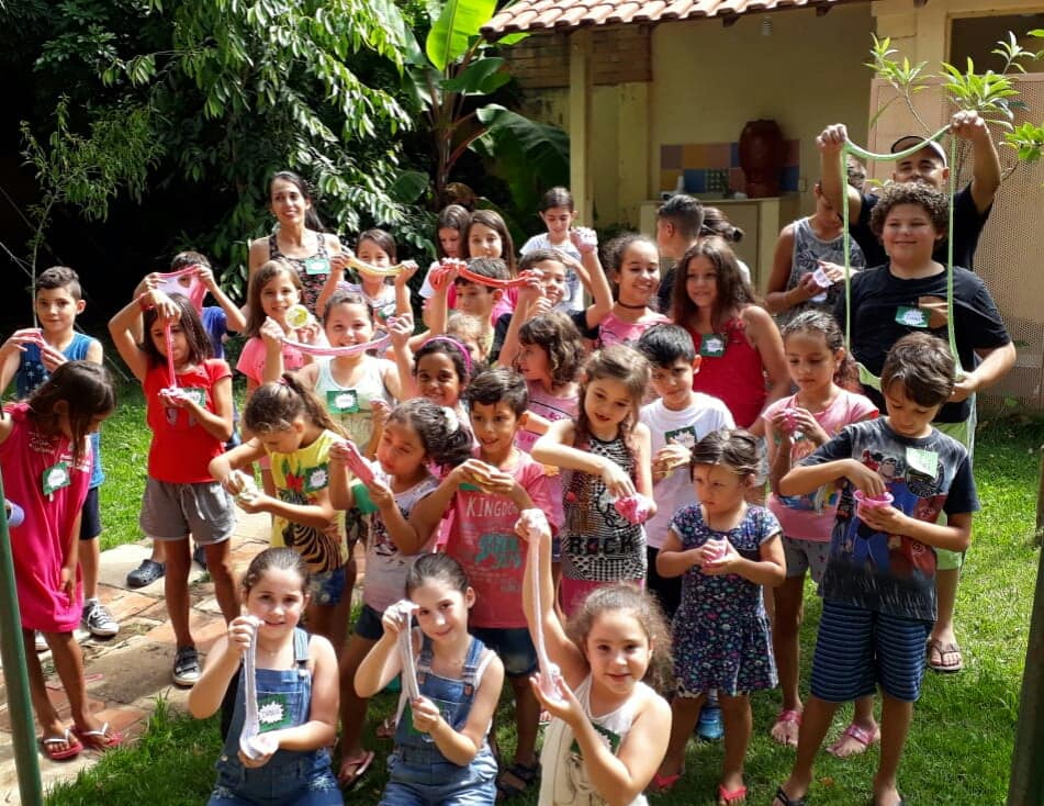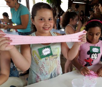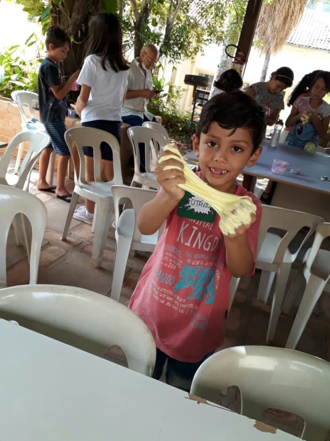 De acordo com Paula Cristina Minatogawa, a receita usada na programação de férias da Biblioteca Infantil, voltada a crianças de 6 a 12 anos de idade, foi passada por uma das participantes e foi um sucesso. Após botarem a mão na massa, a garotada brincou com o slime no quintal da biblioteca.