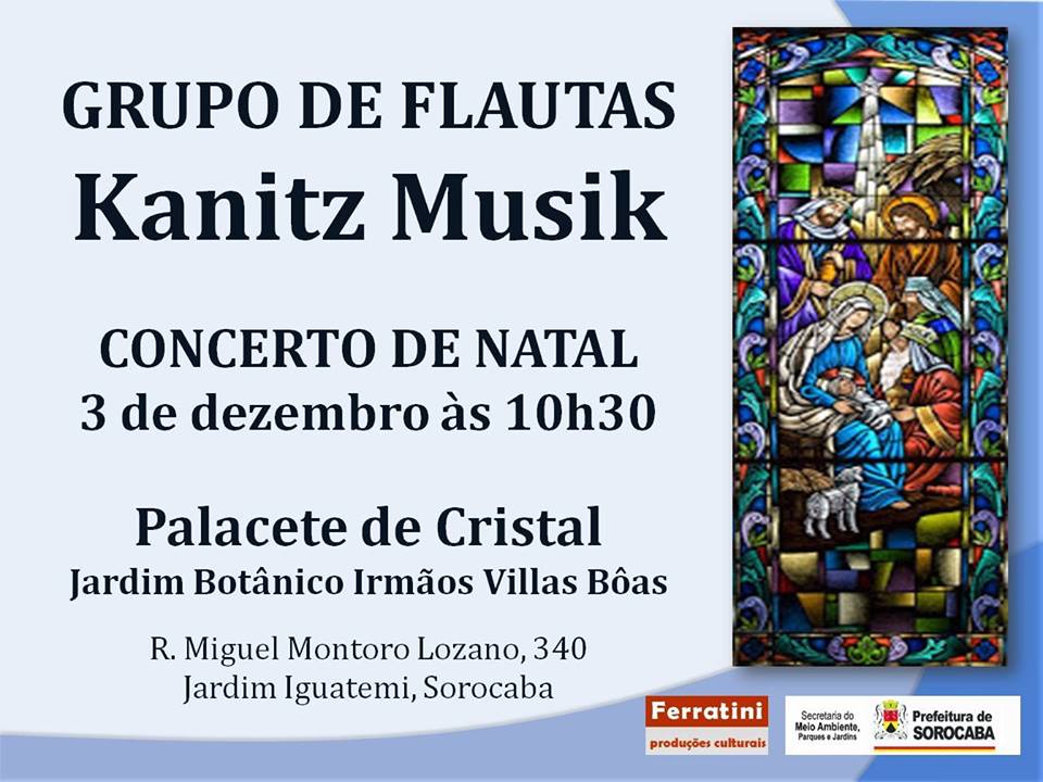 Os visitantes do Jardim Botânico “Irmãos Villas-Bôas” poderão conferir gratuitamente neste domingo (3), às 10h30, um Concerto de Natal com o grupo de flautas Kanitz MusiAk. O público poderá conferir um repertório basicamente erudito, mas há também peças modernas, com arranjos para quarteto de flautas e outras formações.