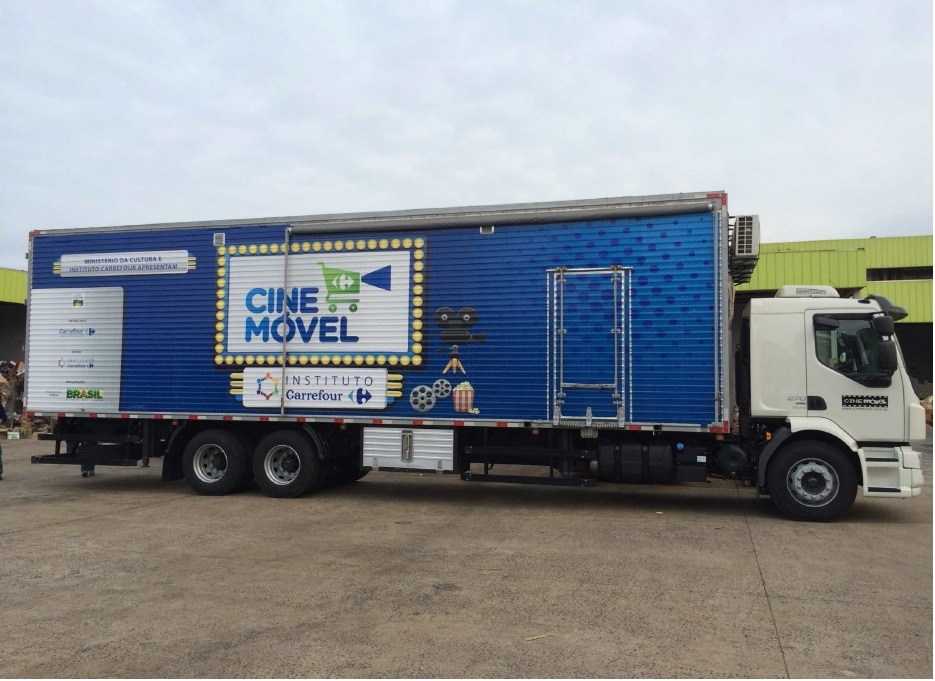 O Cinemóvel Carrefour é um caminhão climatizado que conta com 30 poltronas, tela de 120 polegadas, iluminação própria de cinema, rampa de acesso e duas acomodações para cadeirantes.