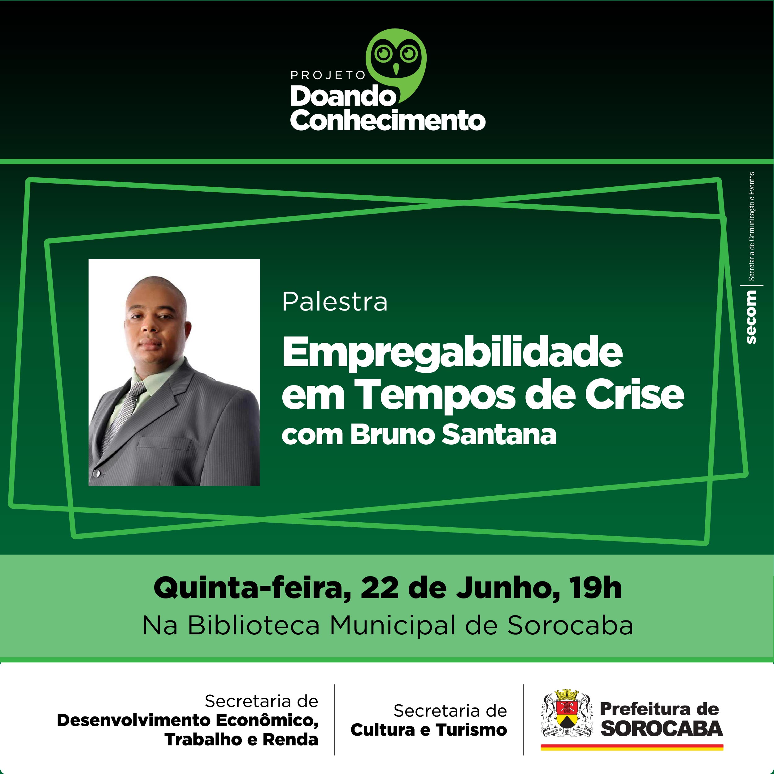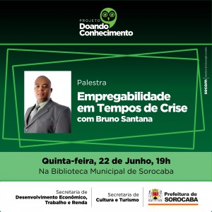 Buscar trabalho em tempos de crise é o foco da palestra que acontece nesta quinta-feira (22), às 19h, na Biblioteca Municipal de Sorocaba, com entrada gratuita. A ação faz parte do projeto “Doando Conhecimento”, promovido pela Secretaria de Cultura e Turismo junto com a Secretaria de Desenvolvimento Econômico, Trabalho e Renda, da Prefeitura de Sorocaba.