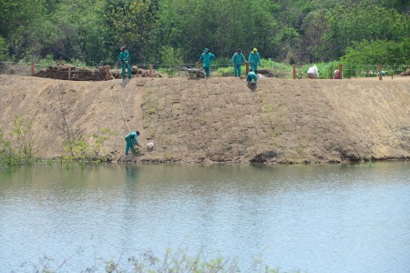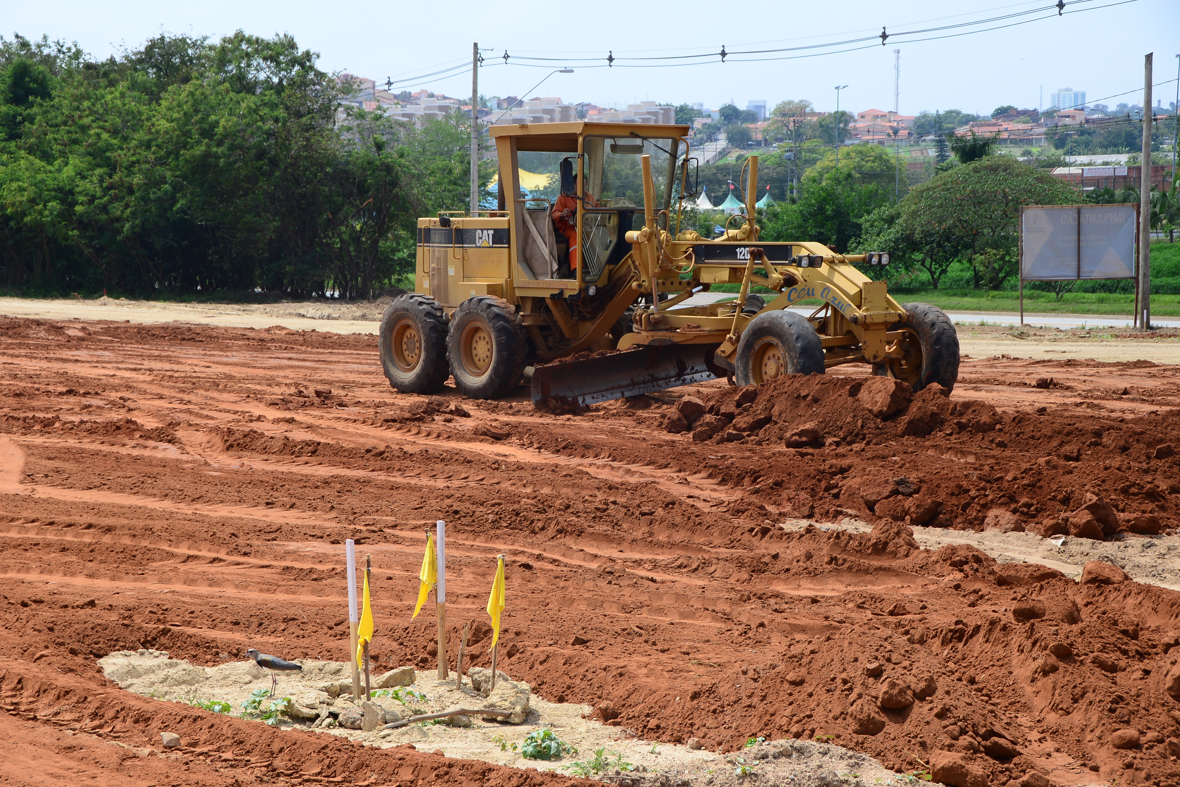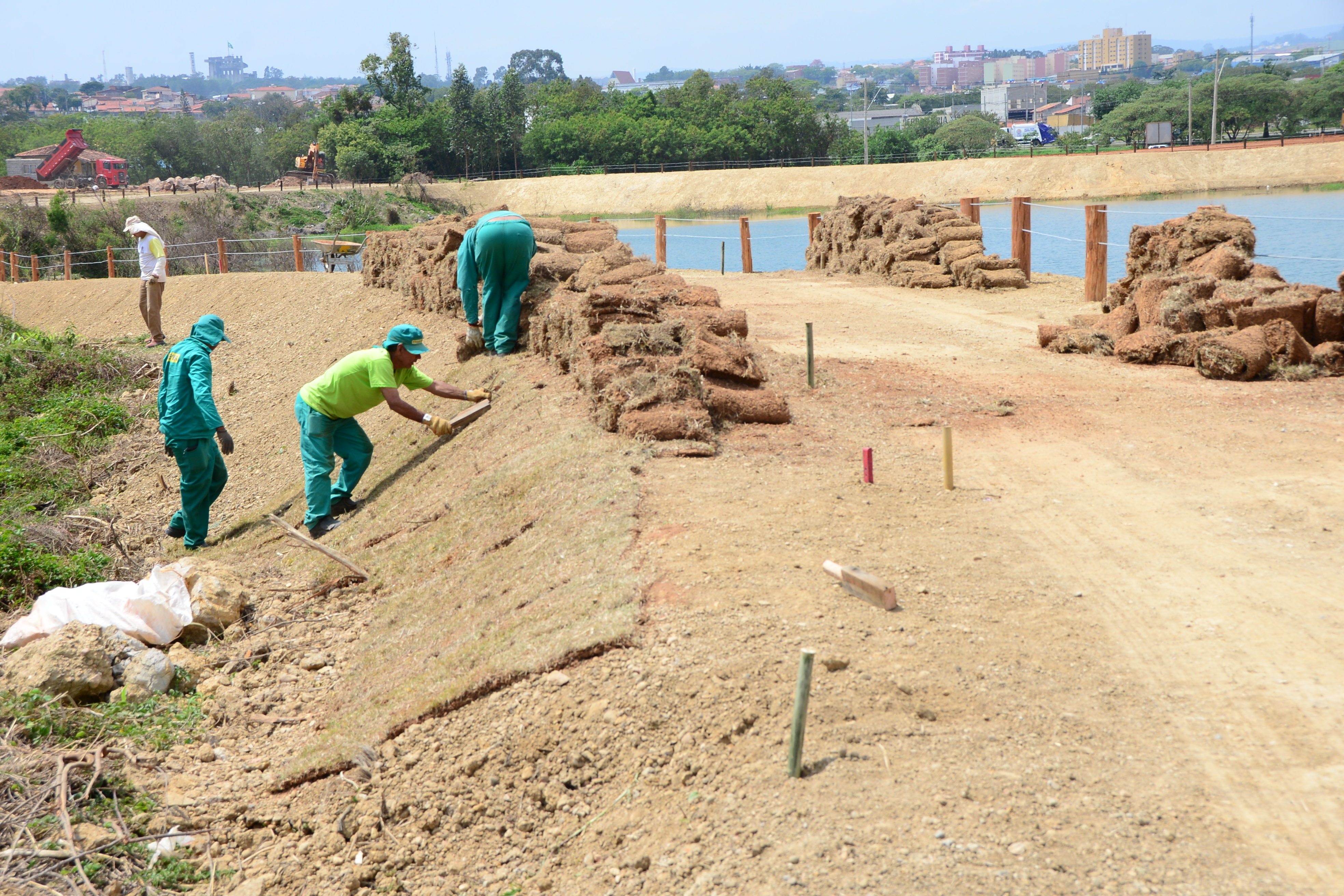Entorno de lago em novo parque começa a receber grama