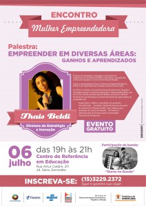 A Secretaria de Desenvolvimento Econômico, Trabalho e Renda da Prefeitura de Sorocaba, em parceria com o Banco do Povo Paulista, o Espaço Empreendedor, a unidade local do Sebrae e a Faculdade de Engenharia de Sorocaba (Facens) realiza no dia 6 de julho, a palestra ‘Empreender em Diversas Áreas: Ganhos e Aprendizados’, dentro do projeto denominado ‘Encontro Mulher Empreendedora’. O evento acontece das 19h às 21h, no Centro de Referência em Educação (CRE).