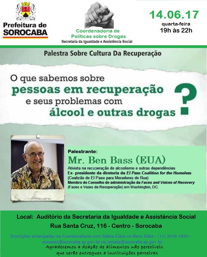 A Coordenadoria de Políticas Sobre Drogas da Secretaria de Igualdade e Assistência Social da Prefeitura de Sorocaba irá promover uma palestra com o ativista norte-americano Ben Bass, considerado um dos maiores especialistas mundiais em políticas públicas para a recuperação de dependentes de álcool e drogas.