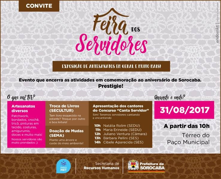 Realizado pela Prefeitura de Sorocaba, por meio da Secretaria de Recursos Humanos (Serh), a atividade encerrará a programação especial de aniversário de 363 anos de fundação de Sorocaba (15 de agosto). O objetivo do evento é valorizar os talentos dos servidores públicos municipais.