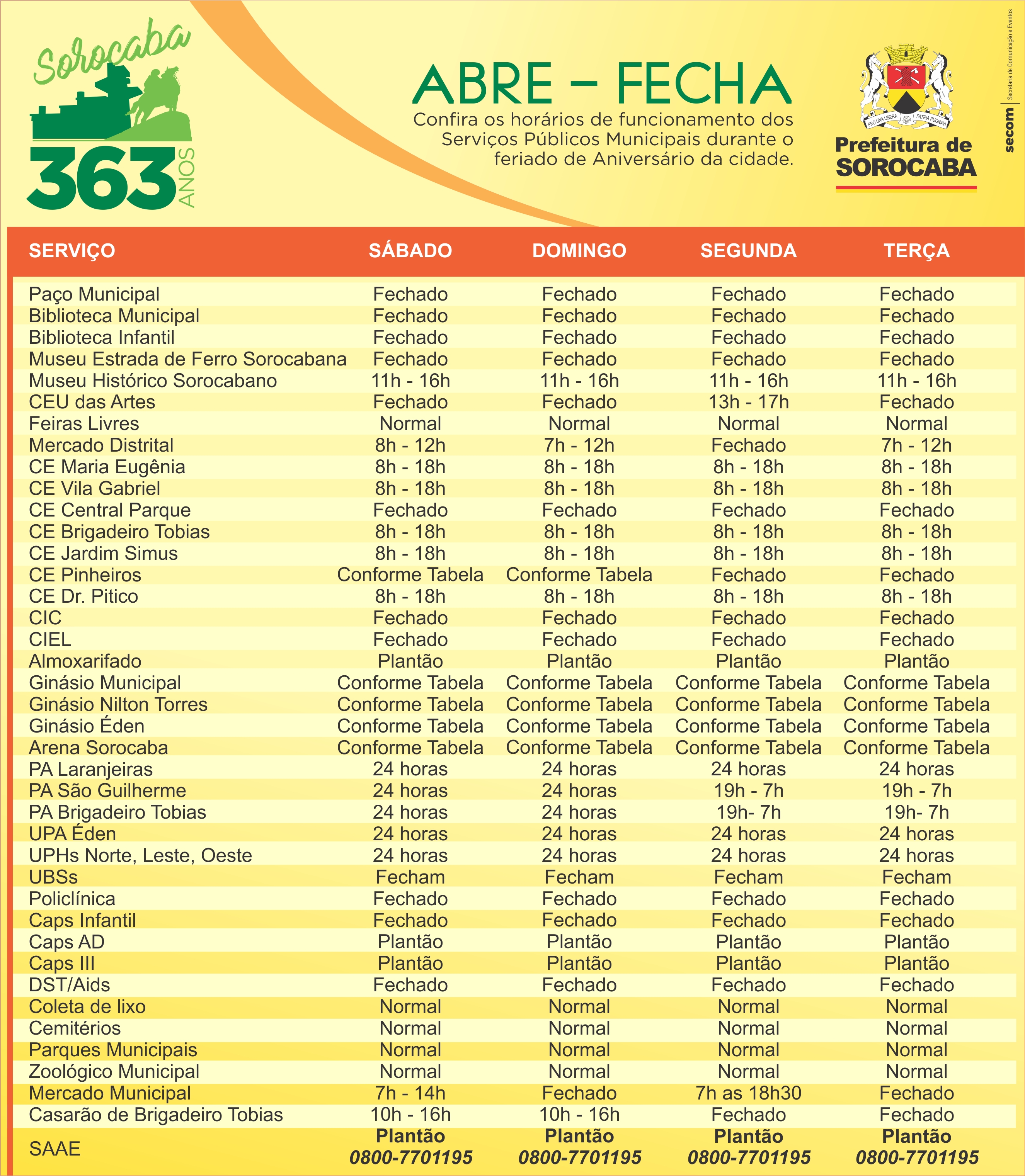 Sorocaba comemora 363 anos na próxima terça-feira (15), e o feriado de aniversário da cidade traz alterações no atendimento aos munícipes, em algumas unidades da Prefeitura de Sorocaba. O Palácio dos Tropeiros, por exemplo, fecha às 17h desta sexta-feira (11) e retoma suas atividades na quarta-feira (16), às 8h. A segunda-feira (14), que antecede o feriado é decretada como ponto facultativo.