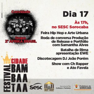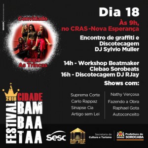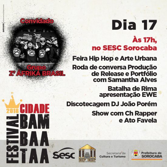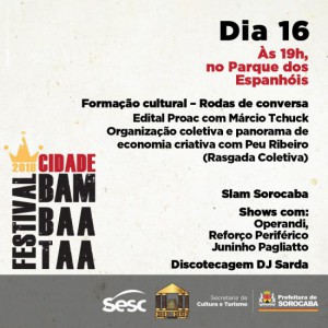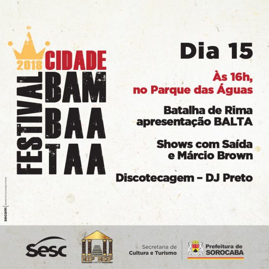 A abertura do Festival Cidade Bambaataa ocorrerá nesta quinta-feira (15), a partir das 16h, no Parque das Águas. Promovido pelo Fórum de Hip Hop de Sorocaba, com a coordenação executiva de Magda Barbosa, o evento contará com a presença de grupos de Rap, DJs, break, grafite, shows, debates, rodas de break, MC’s e muito mais. A programação completa pode ser conferida no link: http://cultura.sorocaba.sp.gov.br/. Mais informações também podem ser obtidas pelo WhatsApp (15) 99108-7286.