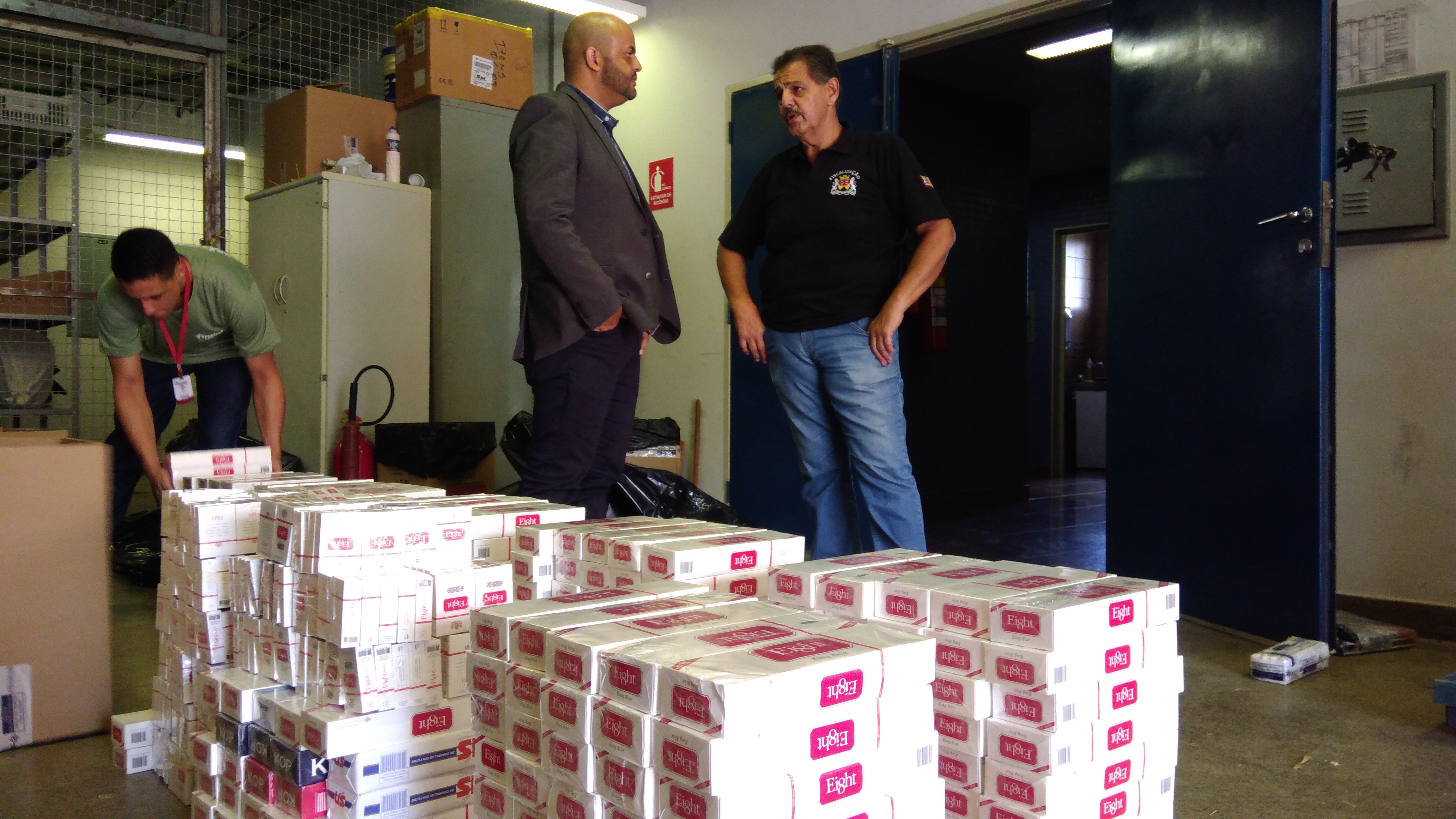 Foto – Secretário de Segurança e Defesa Civil, Jeferson Gonzaga (de blazer) acompanha a entrega dos cigarros à Receita Federal.