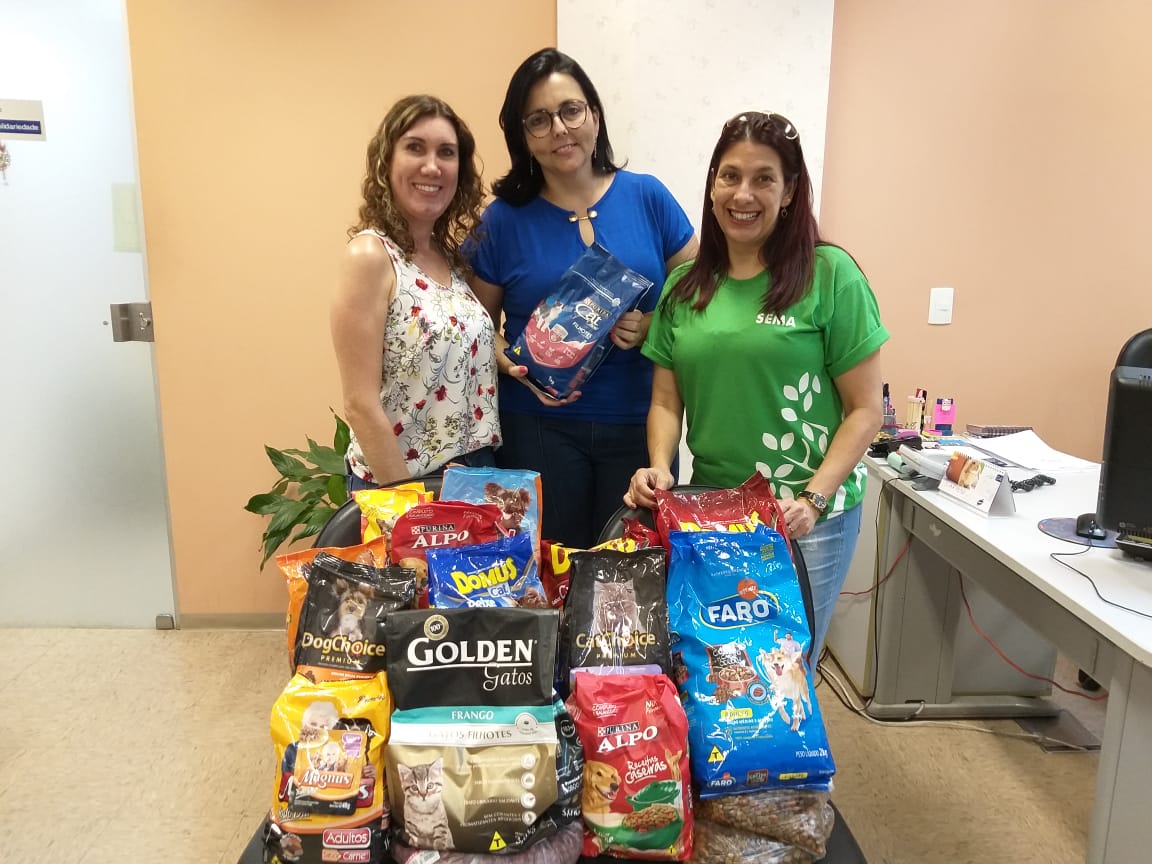 Nesta terça-feira (15), o Fundo Social de Solidariedade (FSS) recebeu 20 kg de ração de cães e gatos para destinar a uma ONG da cidade que cuida de animais abandonados. O produto, entregue pela equipe da Secretaria do Meio Ambiente, Parques e Jardins (Sema), foi fruto de uma tarefa social realizada com as crianças que participaram do curso “Férias na Bica”.