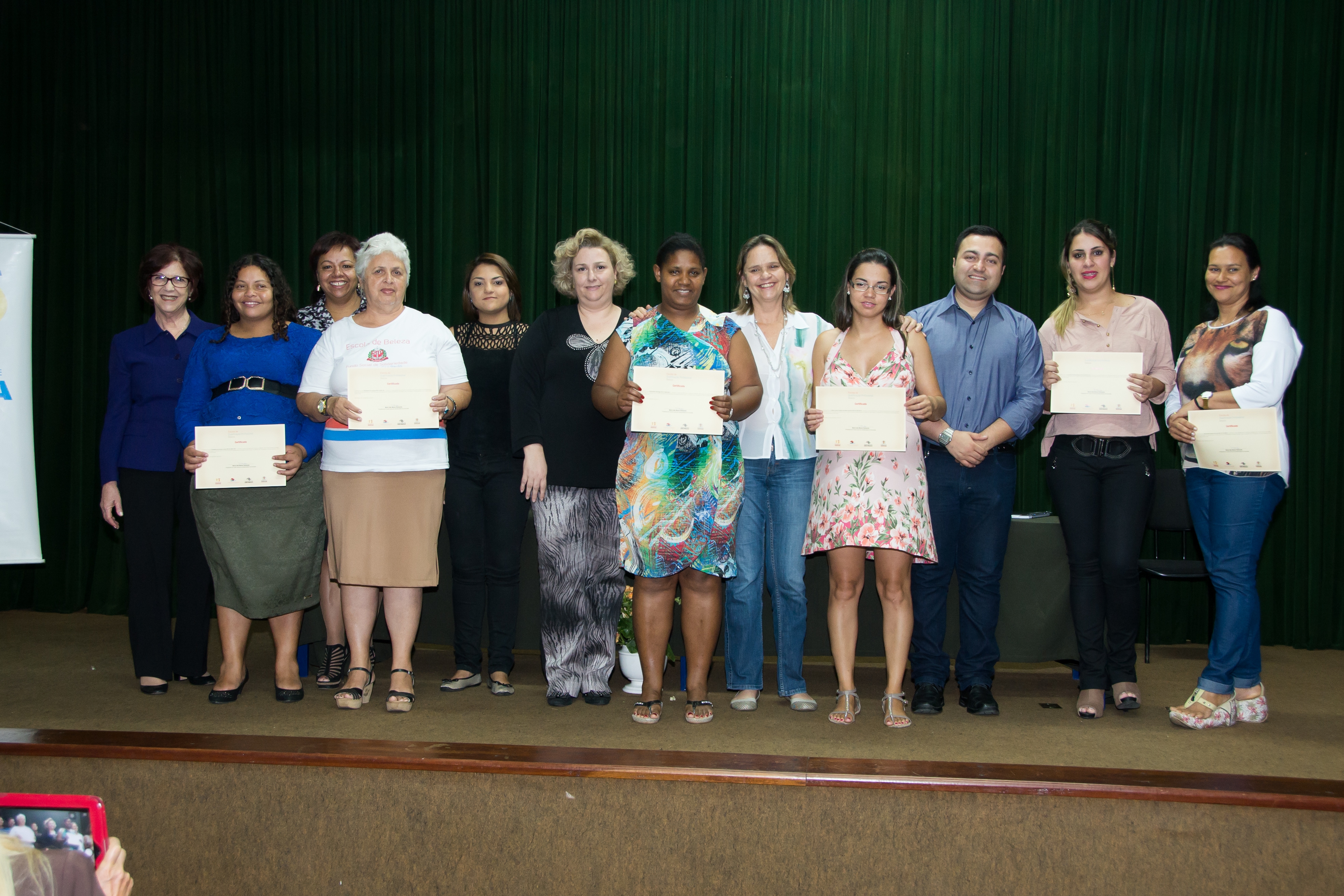 Receberam certificado das mãos da presidente do FSS, Maria Inês Moron Pannunzio, e da vice-prefeita Edith Di Giorgi, e do representante do Fundo Social de Solidariedade do Estado de São Pualo (Fussesp), Jefferson Fróes, 45 alunos da segunda turma dos cursos de assentador de pisos e azulejos, pedreiro e encanador e dez alunas da primeira turma do curso de manicure e pedicure.
