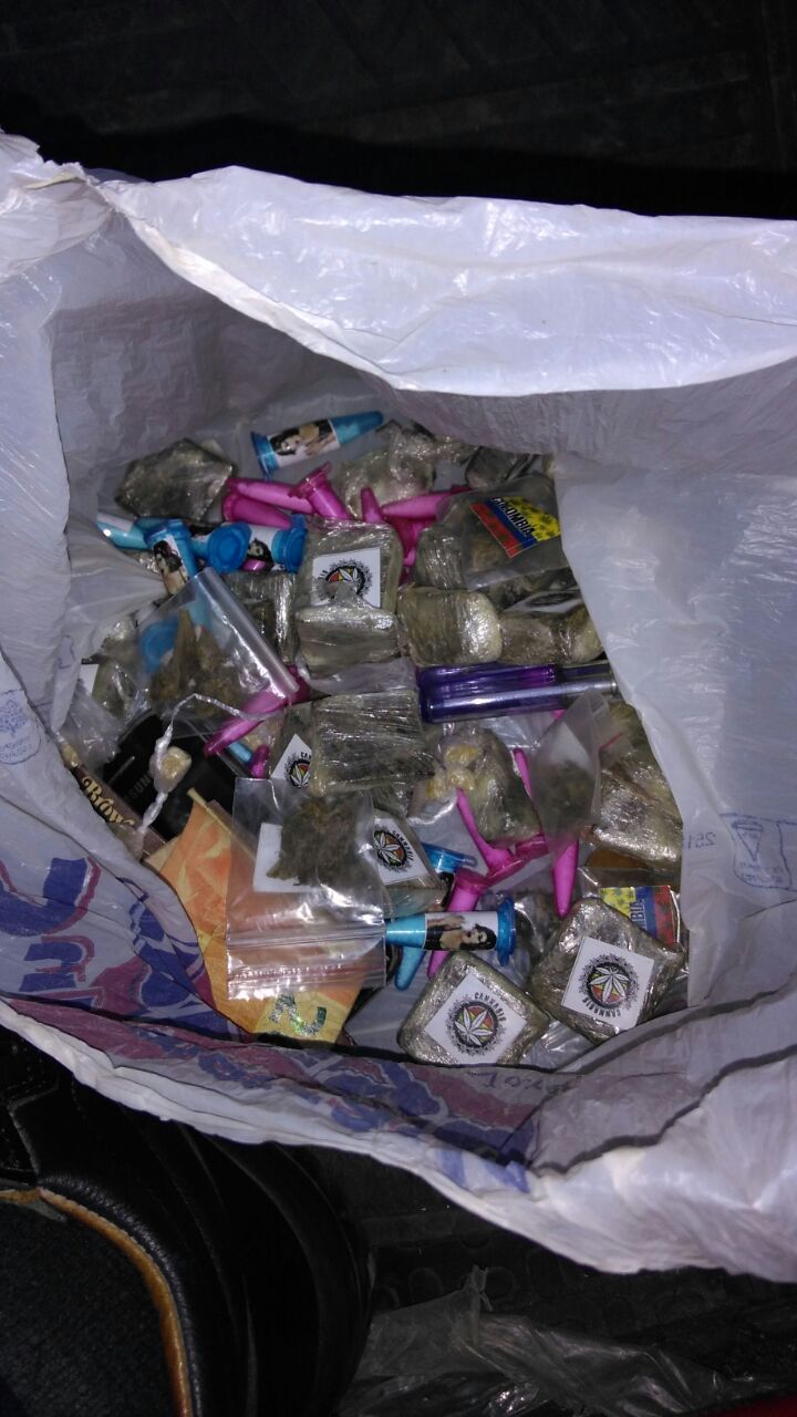 Enquanto a guarnição acompanhava os fugitivos, percebeu que um deles tentou se desvencilhar de uma sacola plástica que trazia consigo. Momentos depois ambos os meliantes foram interceptados pelos agentes policiais, que então procederam a uma abordagem pessoal. Em um indivíduo nada de ilícito foi encontrado, quanto ao outro que abandonara a sacola, os guardas encontraram um isqueiro e uma porção de substância análoga à maconha.