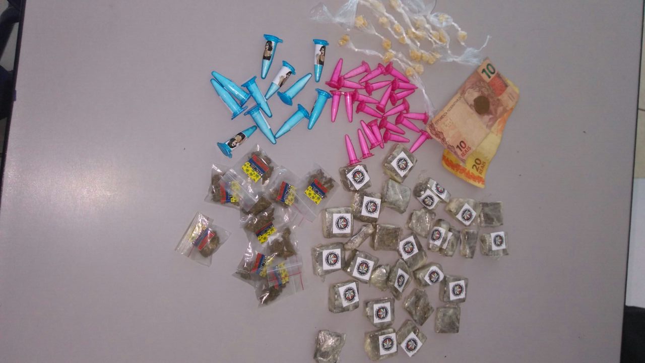 Ao retornarem para buscar a sacola, os guardas constataram que no interior desta havia 39 (trinta e nove) porções de material similar à maconha, 34 (trinta e quatro) frações de um pó branco aparentando ser cocaína, distribuídas em flaconetes, 21 (vinte e um) pedaços de pedra parecida com crack, acondicionadas em um plástico transparente, além de R$ 30,05 (trinta reais e cinco centavos) em dinheiro.